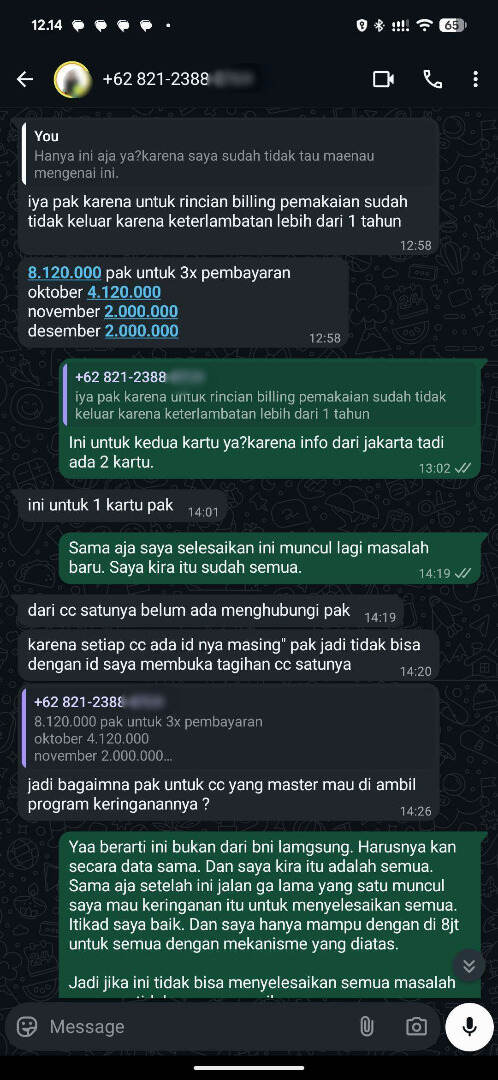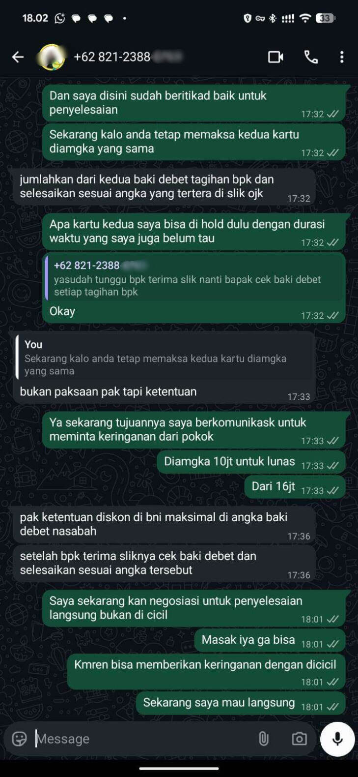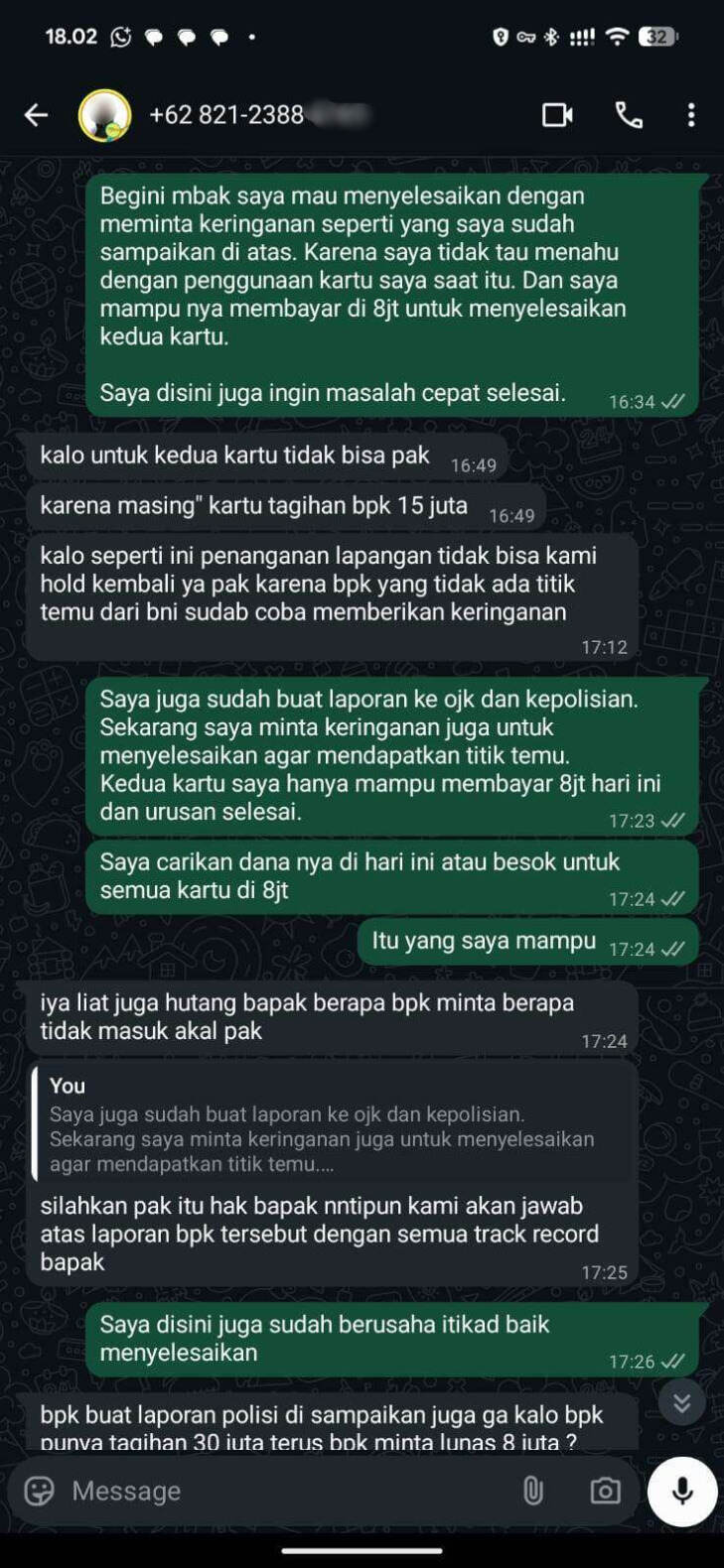 Kemudian muncul rekapan total utang saya sebesar Rp15 juta sekian. Saya meminta keringanan untuk penyelesaian, dan setelah negosiasi, disepakati nilai Rp8 juta dengan sistem cicilan. Namun belakangan saya baru sadar bahwa penyelesaian tersebut hanya untuk satu kartu, padahal saya kira untuk kedua kartu.