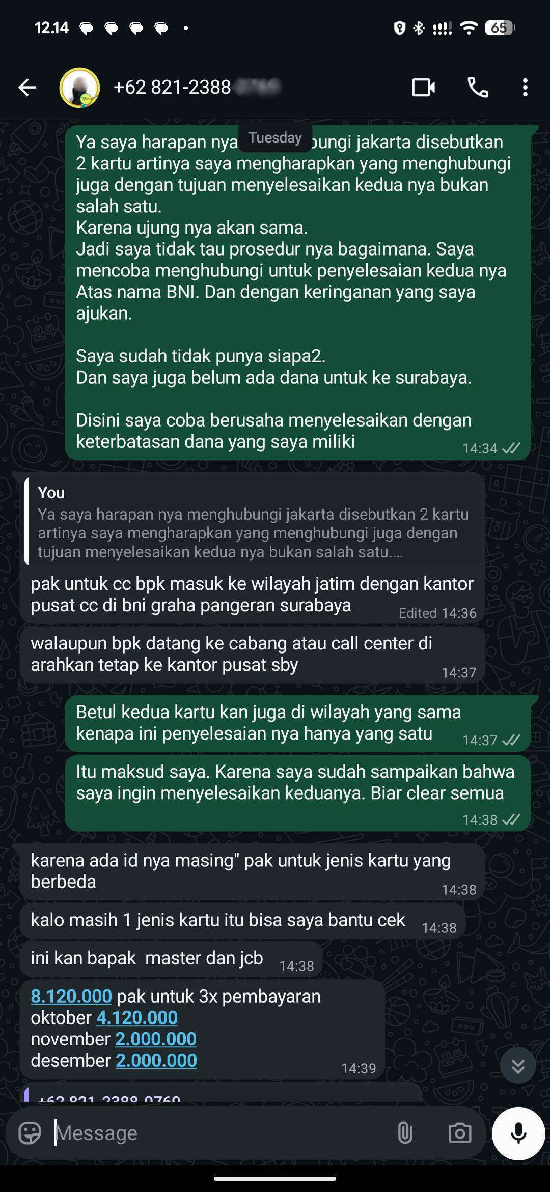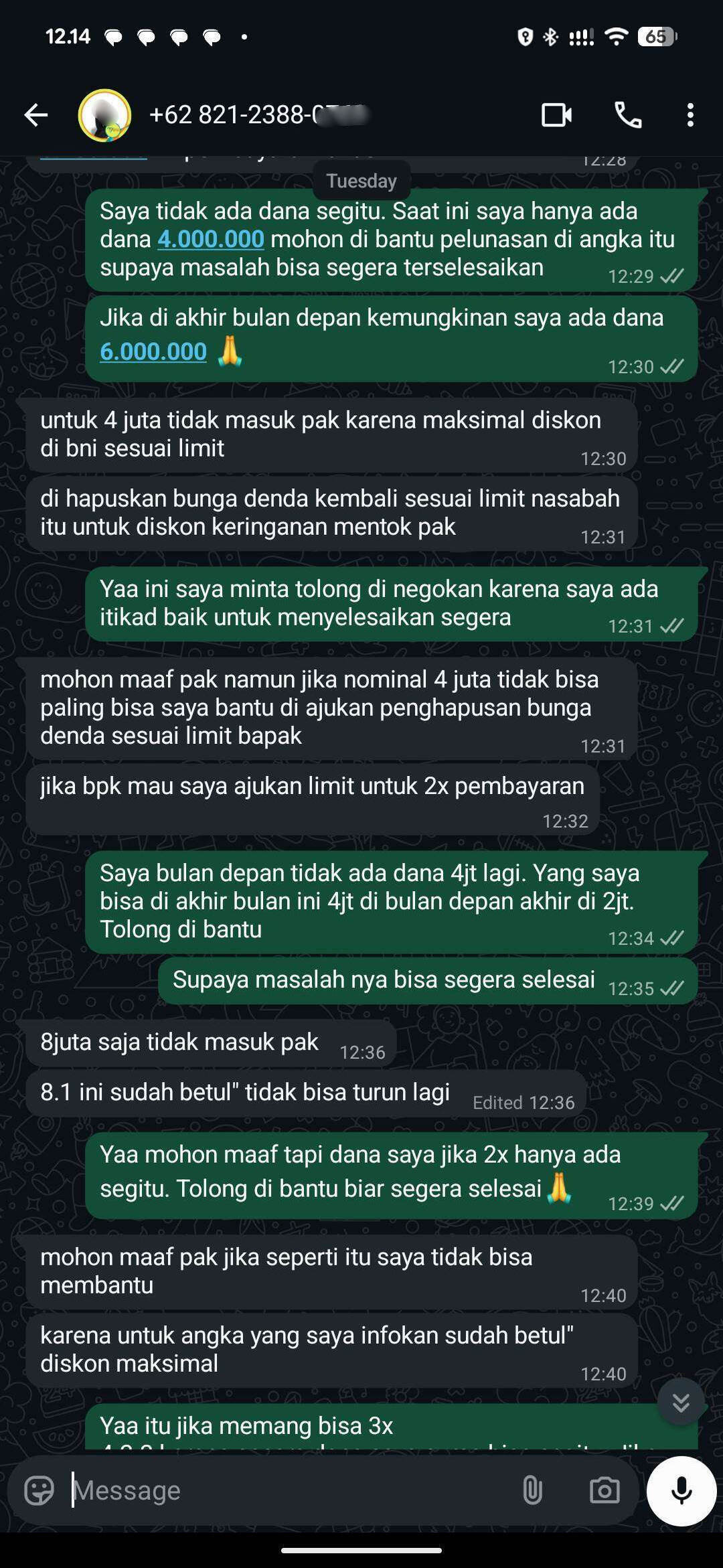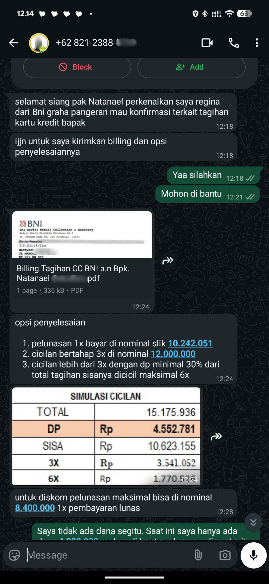 Kemudian muncul rekapan total utang saya sebesar Rp15 juta sekian. Saya meminta keringanan untuk penyelesaian, dan setelah negosiasi, disepakati nilai Rp8 juta dengan sistem cicilan. Namun belakangan saya baru sadar bahwa penyelesaian tersebut hanya untuk satu kartu, padahal saya kira untuk kedua kartu.