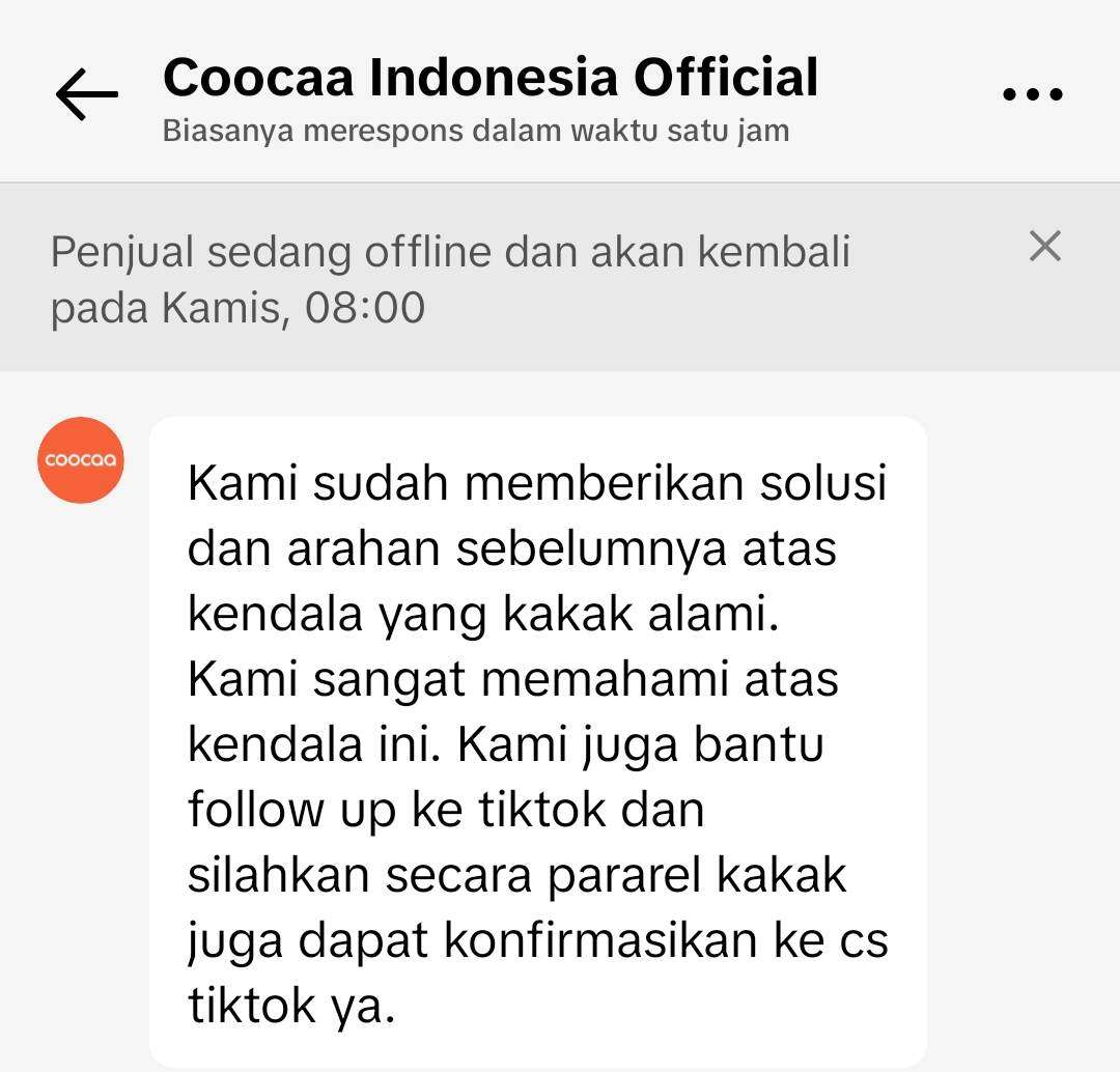 Produk yang saya beli adalah barang elektronik, dan sejak awal saya sudah menanyakan kepada penjual mengenai garansi panjang dan asuransi pengiriman yang termasuk. Penjual bahkan setuju untuk melanjutkan investigasi dengan jasa pengiriman. Namun pihak platform TikTok Shop tidak berani menindaklanjuti permintaan dari saya maupun penjual untuk investigasi lebih lanjut.
