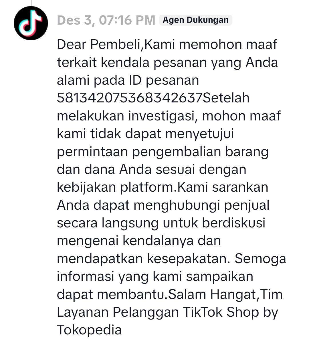 Melalui surat ini, saya berharap pihak TikTok Shop maupun penjual dapat memberikan tanggapan dan penyelesaian yang seharusnya. Selain itu, saya juga berharap pengalaman saya ini dapat menjadi perhatian bagi pihak terkait agar kejadian serupa tidak menimpa konsumen lainnya.