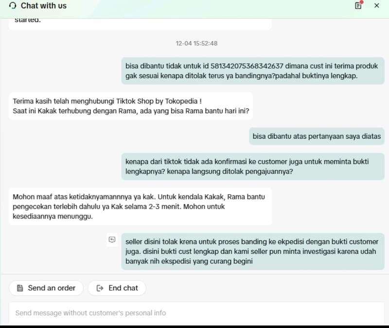 Jika seperti ini, sudah masuk ranah penipuan, dan platform TikTok Shop sama sekali tidak bertanggung jawab dalam memfasilitasi banding ke jasa pengiriman! Saya bingung mau mengadu ke siapa lagi, selain setiap hari follow up ke customer service TikTok Shop atau penjual, hingga batas maksimal pengajuan sekitar 14 Desember 2025.