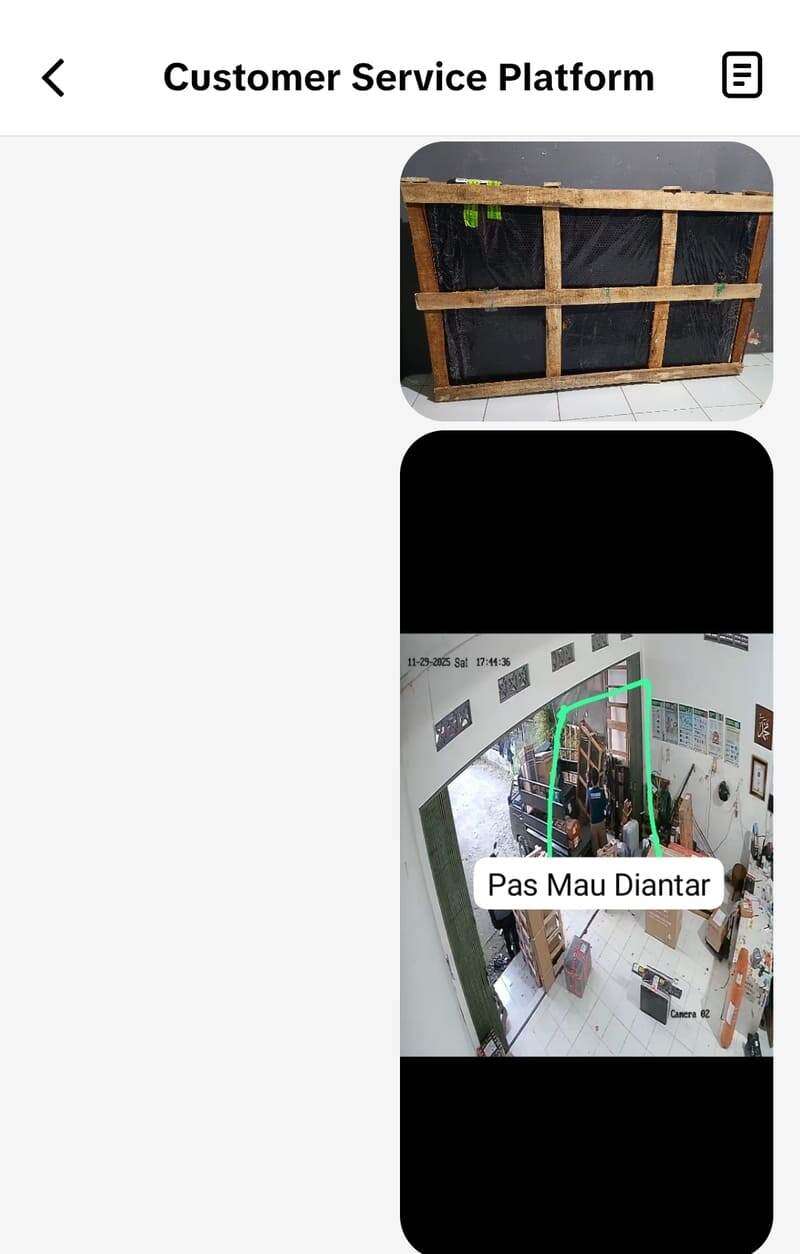 Saya juga memiliki bukti pendukung yang cukup kuat, seperti video CCTV dari pengiriman terakhir J&T Cargo yang menunjukkan paket saya. Dari video tersebut, terlihat bahwa kondisi kemasan masih sama dengan yang saya terima. Ini sangat berbeda dengan klaim penjual yang menyatakan ada stiker fragile di antara sekat kemasan kayunya, padahal sudah jelas terlihat di CCTV bahwa apa yang saya terima berbeda.