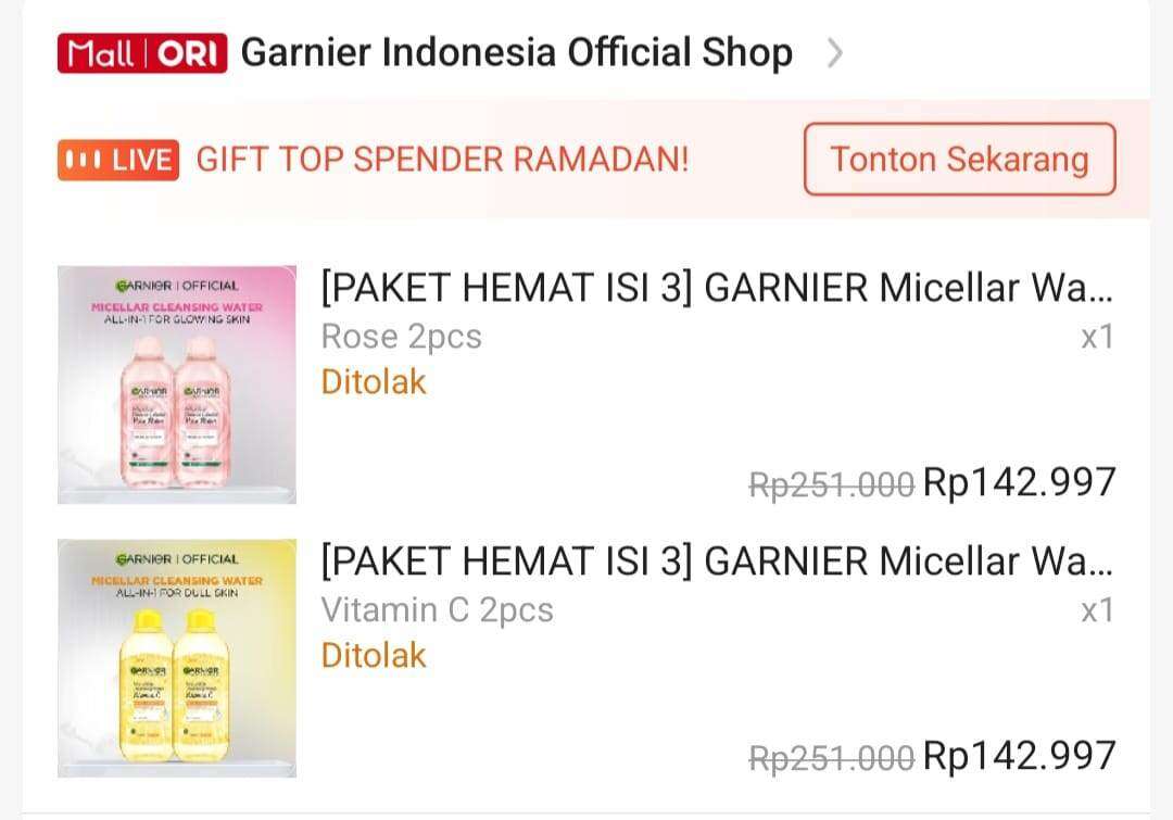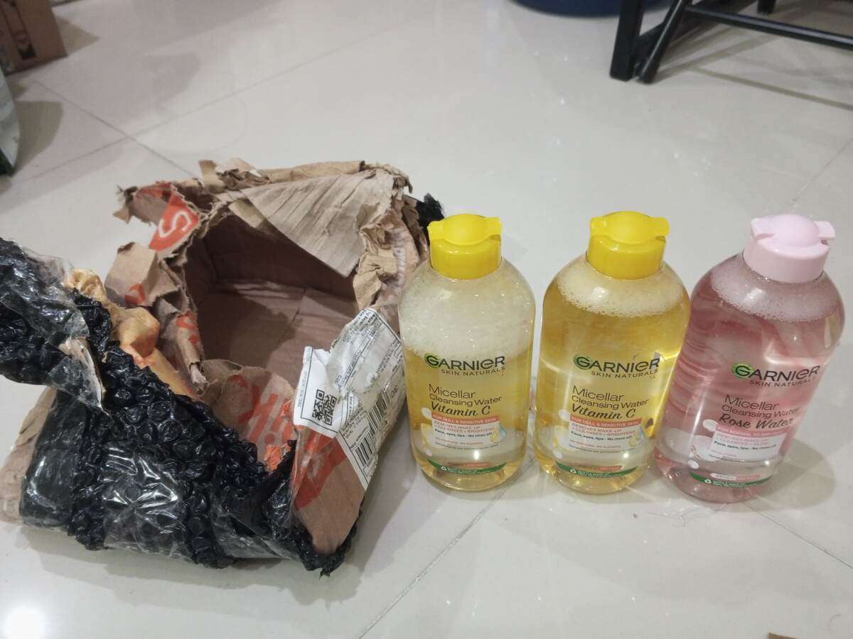 Saya melakukan pembelian barang di Shopee dengan nomor resi SPX: SPXID067683670082, yaitu dua botol Garnier Micellar Water Rose dan dua botol Vitamin C seperti yang terlihat di gambar.