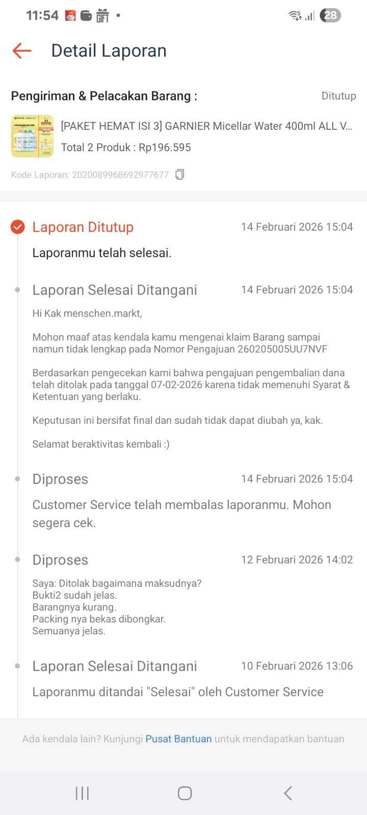 Saya segera mengajukan komplain ke customer service Shopee, tetapi jawabannya sangat mengecewakan. Komplain saya ditolak dengan alasan “tidak memenuhi syarat dan ketentuan yang berlaku.” Padahal, saya sudah memiliki bukti yang jelas dari foto kurir saat paket tiba di rumah, serta foto dan video unboxing barang tersebut.