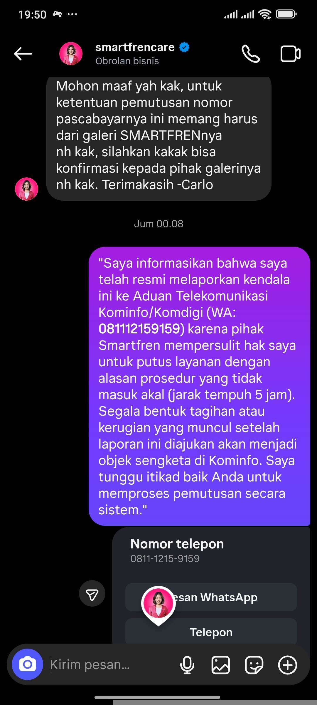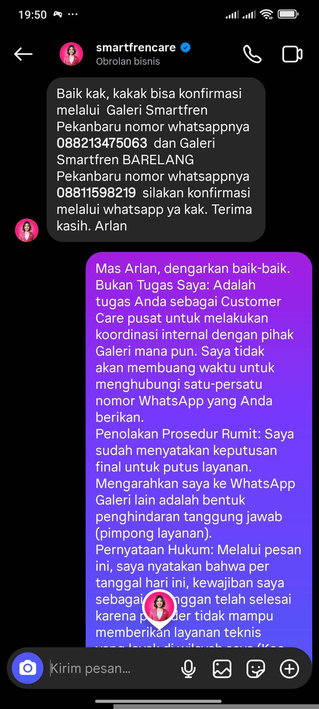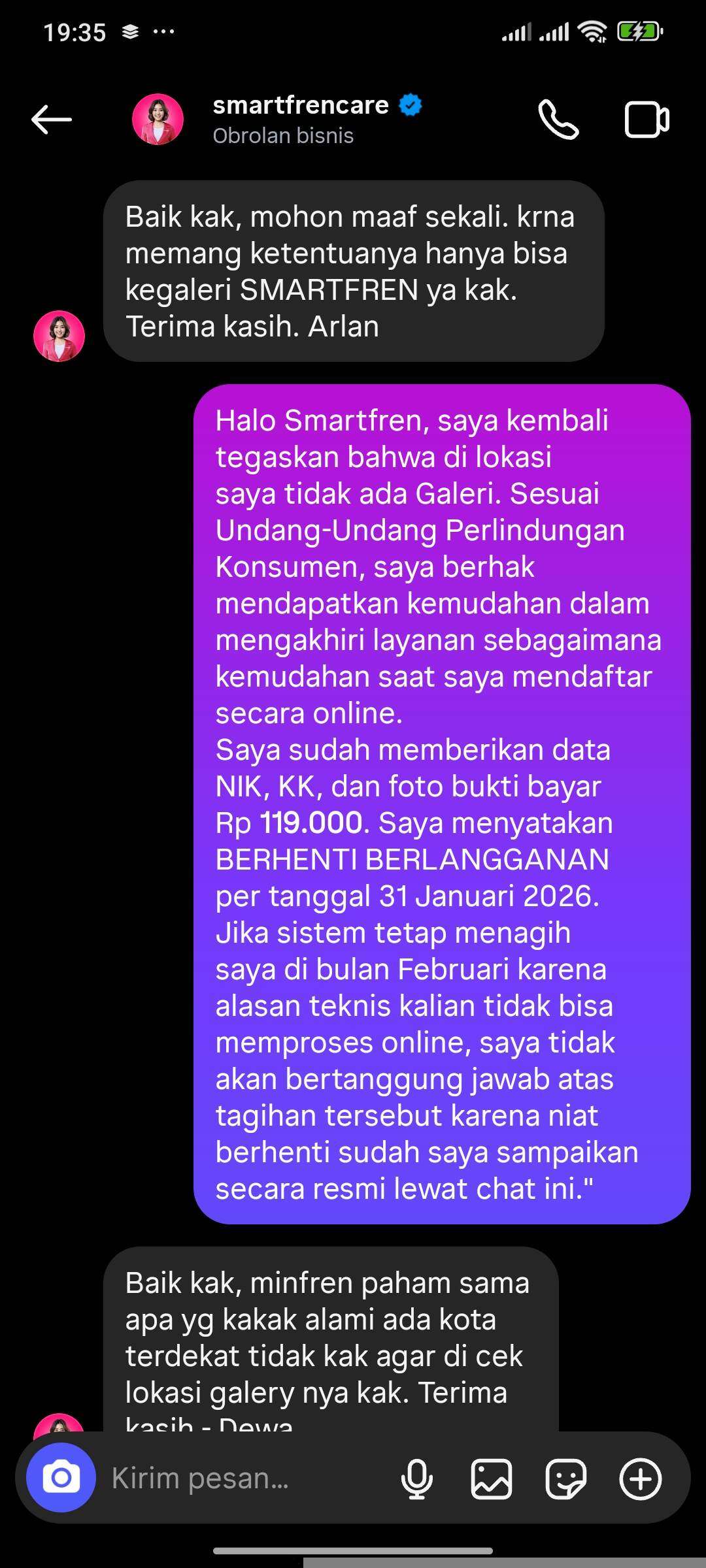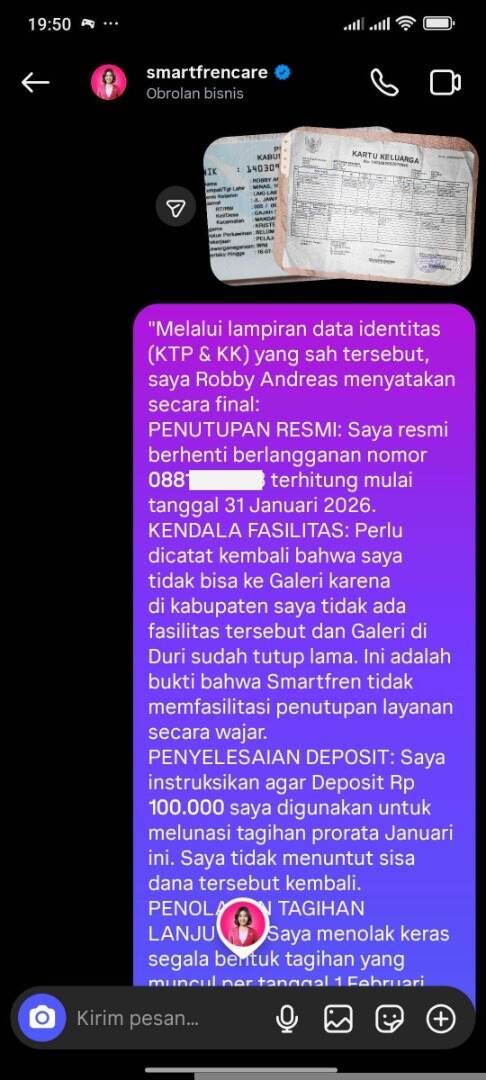 Saya sudah mengirimkan foto KTP dan KK asli melalui DM Instagram resmi Smartfren untuk proses verifikasi secara daring.Pihak Smartfren (melalui agen Gh***, Ta**, Fi**) terus mengulang jawaban template yang sama dan memaksa meminta nomor telepon alternatif. Padahal, saya sudah tegaskan berkali-kali hanya menerima komunikasi tertulis (email/DM) sebagai bukti hukum yang sah.