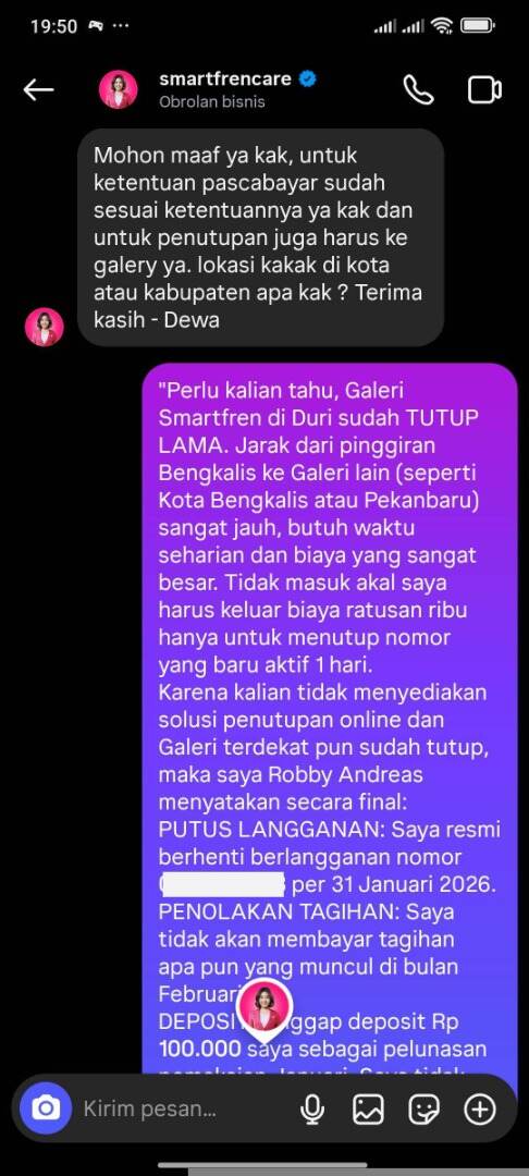 Pihak Smartfren Memaksa Saya Datang ke Galeri Smartfren yang Lokasinya Jauh untuk Penutupan Nomor Pascabayar