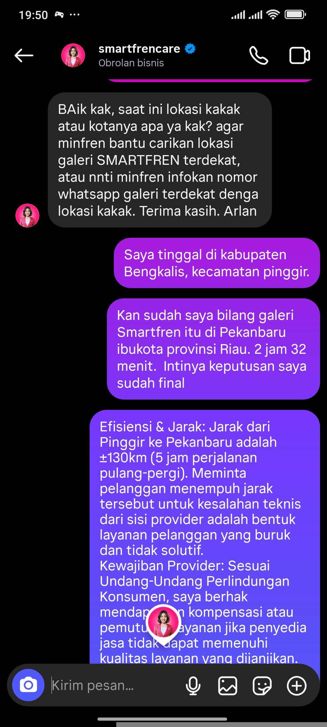 Kronologinya, permintaan penutupan telah saya jukan sejak bulan Januari: Saya telah berupaya untuk menutup layanan sebelum periode Februari berjalan, agar tidak ada tagihan baru. Namun, pihak CS memaksa saya untuk datang ke Galeri Smartfren secara fisik. Padahal Galeri Smartfren di kota saya (Duri) telah tutup permanen. Jarak ke Galeri terdekat di Pekanbaru mencapai 130 Km (±5 jam perjalanan). Sangat tidak masuk akal jika konsumen dibebankan kendala operasional perusahaan.