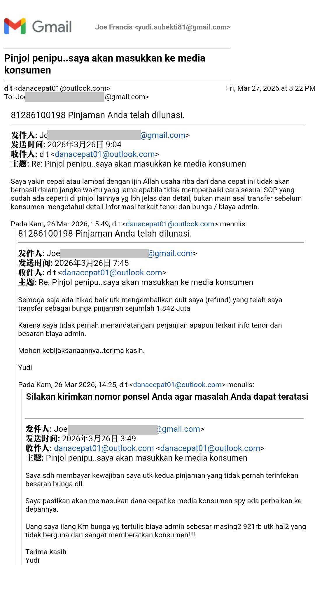 Demikian saya sampaikan dan semoga dapat menjadi pembelajaran semua pihak, dan mohon untuk OJK kembali mengevaluasi pinjol Dana Cepat ini karena perjanjian yang dibuat tidak sesuai peraturan yang berlaku.