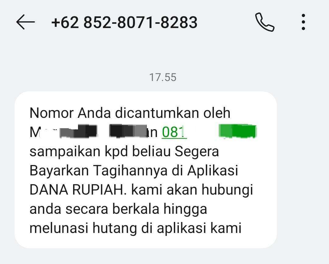 Hal ini terjadi karena orang lain menggunakan nomor ponsel saya sebagai nomor telepon darurat. Itu bukan urusan saya, yang jelas saya tidak ada kaitan dengan utang piutang Dana Rupiah. Pihak Dana Rupiah tidak pernah mengonfirmasi kepada saya apakah saya benar-benar penanggung jawab atau kontak darurat yang bersangkutan. Ngutang langsung diokekan, giliran gak dibayar saya yang diteror.