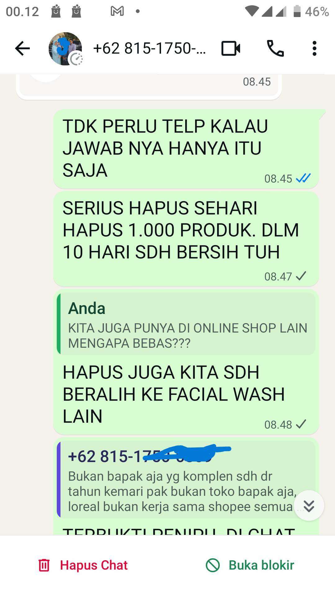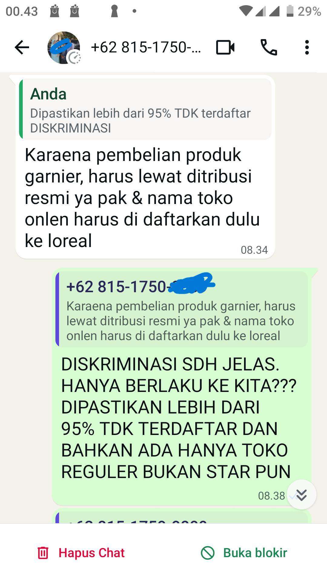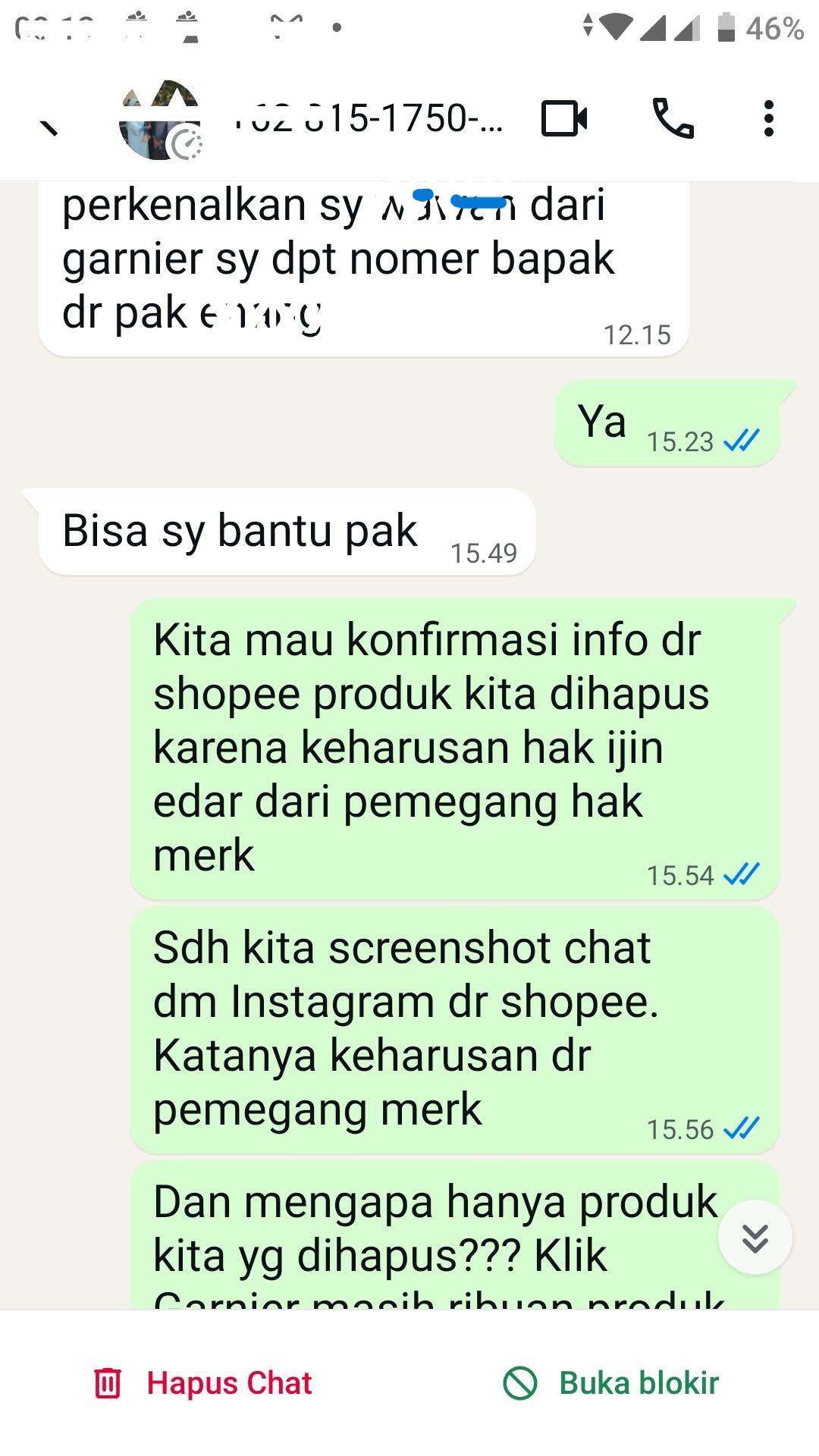 Tidak lama setelah chat melalui WhatsApp, nomor kami langsung diblokir. Terlihat pada lampiran bahwa chat hanya centang satu. Selain itu, chat di internal Garnier juga tidak dibalas lagi.