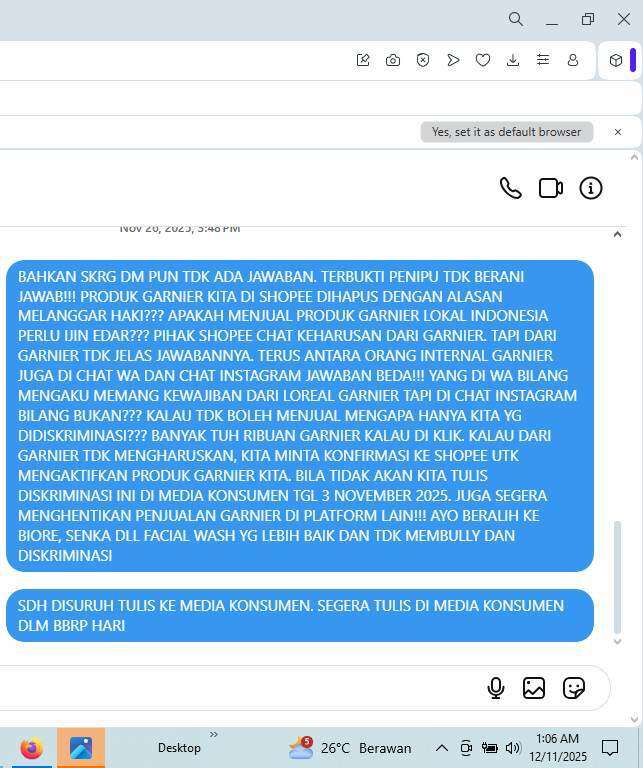 Beberapa hari kemudian, ada staf Garnier yang menghubungi kami melalui WhatsApp, tetapi jawabannya berbeda lagi dengan informasi sebelumnya. Bahkan di antara internal Garnier sendiri jawabannya sudah tidak konsisten.
