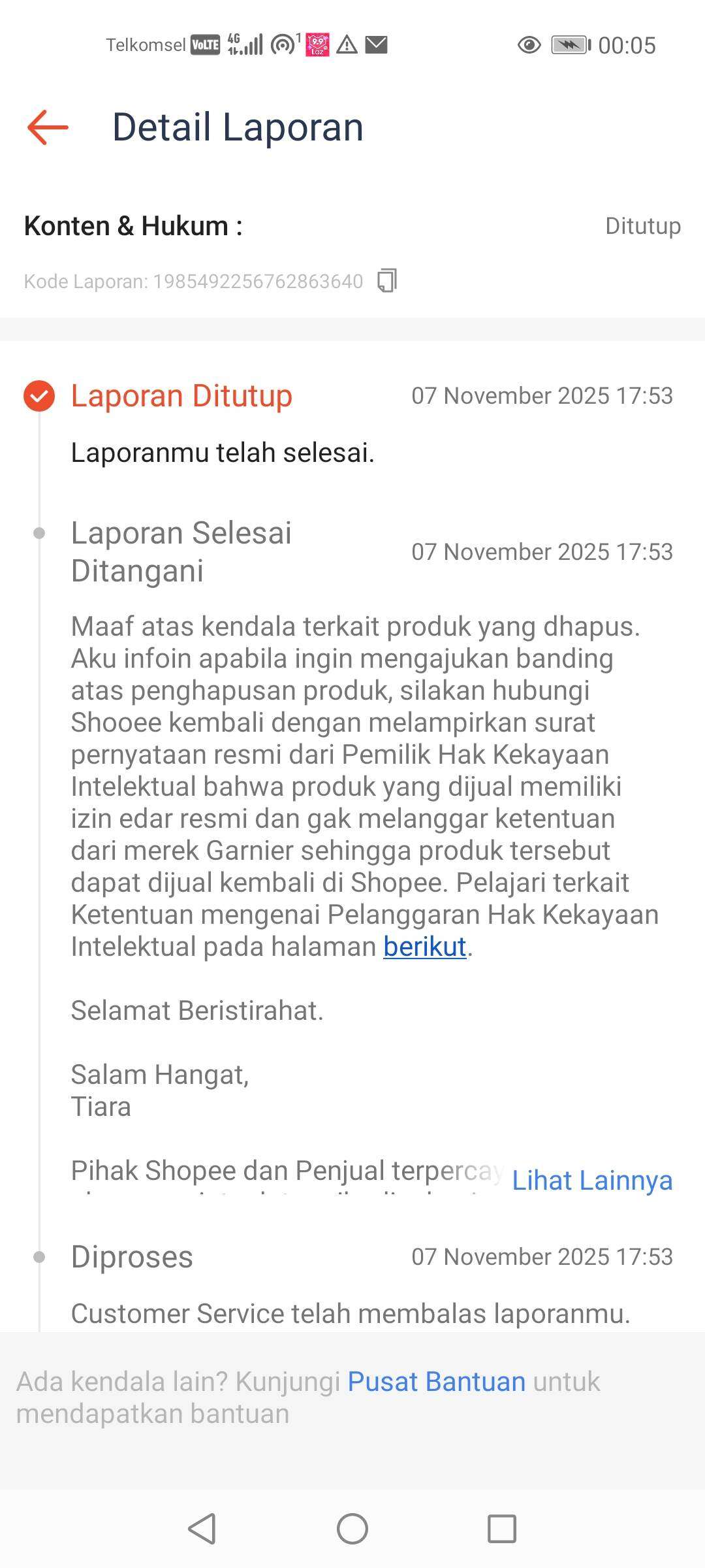 Kami ingin mengonfirmasi bahwa pada tanggal 28 Oktober 2025, kami membuat laporan ke Shopee dan Garnier terkait penghapusan produk Garnier di toko kami. Dari pihak Shopee dijelaskan bahwa penghapusan tersebut dilakukan atas permintaan Garnier. Namun dari pihak Garnier melalui chat justru menyatakan bukan dari mereka. Mana yang benar?