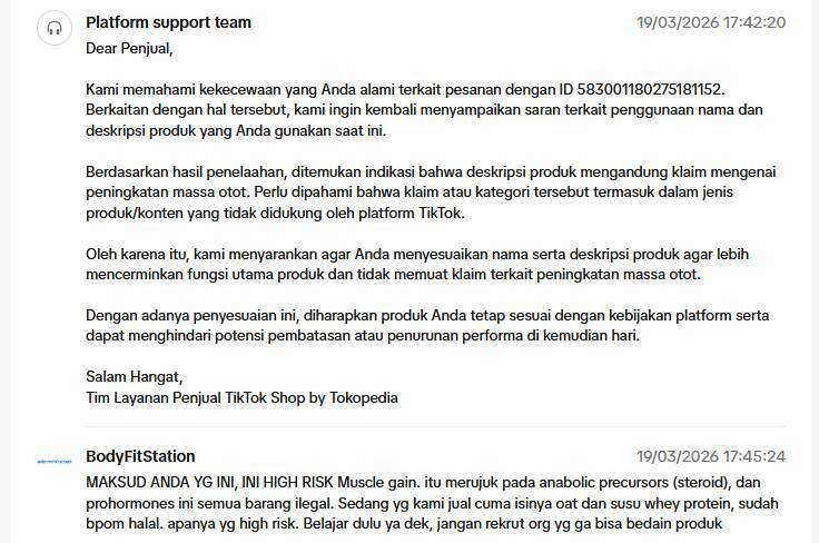 Update terbaru, pengajuan banding kami terhadap keputusan TikTok Shop ditolak dengan alasan lain, yang menyatakan bahwa produk kami mengandung unsur peningkatan massa otot. Padahal dalam guidelines tidak ada yang menyebutkan hal tersebut. Kami sudah mengajukan banding berkali-kali, tetapi tetap dijawab dengan alasan yang sama, seperti balasan otomatis dari chatbot.