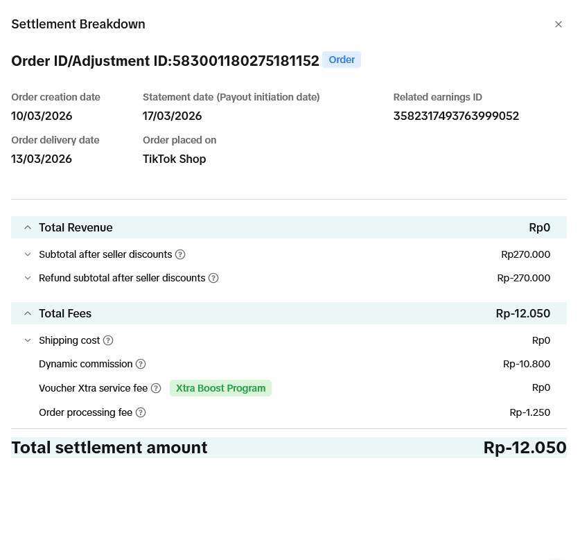 - Potongan fee TikTok Shop: Rp12 ribu.