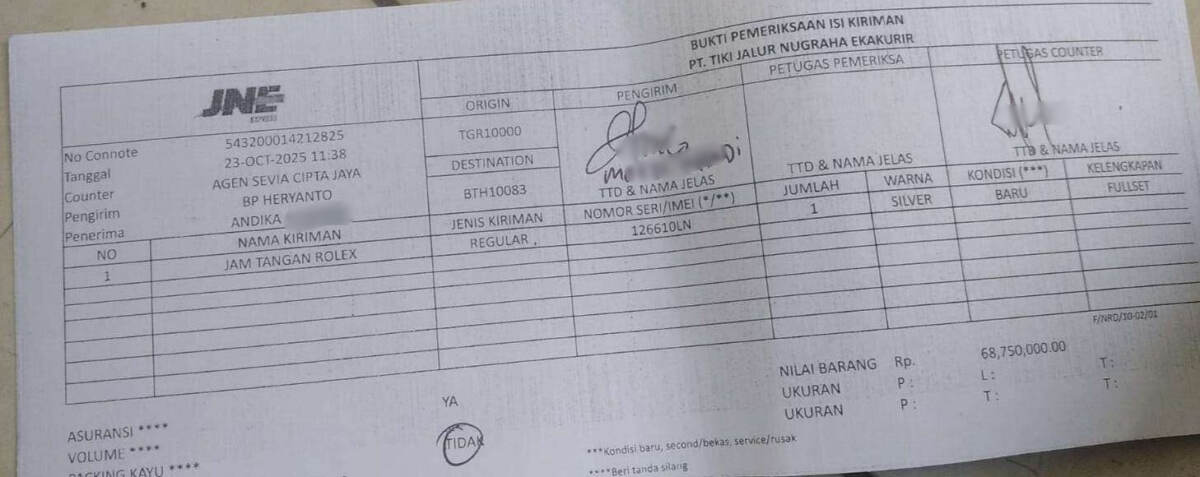 Pada tanggal 23 Oktober 2025 saya mengirim barang ke gerai JNE di Tigaraksa, Tangerang berupa jam tangan Rolex Submarine.
