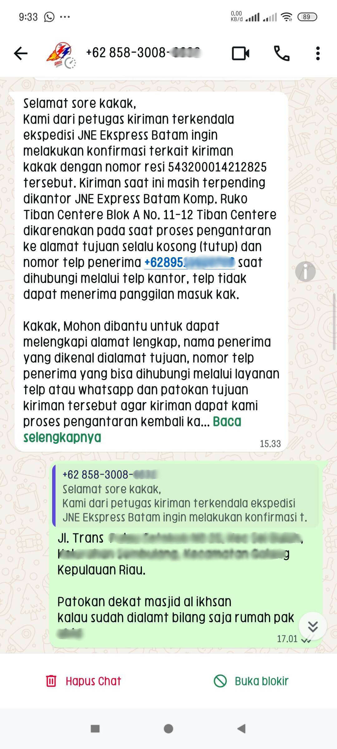 Dan karena pihak buyer akan keluar kota, pihak buyer mengonfirmasi kepada saya selaku penjual meminta pembatalan karena tidak sesuai estimasi dan paket pun entah berada di mana. Pihak buyer mengonfirmasi ke pihak JNE Batam pada tanggal 1 November 2025 bahwa apabila barang ditemukan harap dikembalikan atau return ke saya (penjual), karena posisi buyer sedang dinas keluar kota.