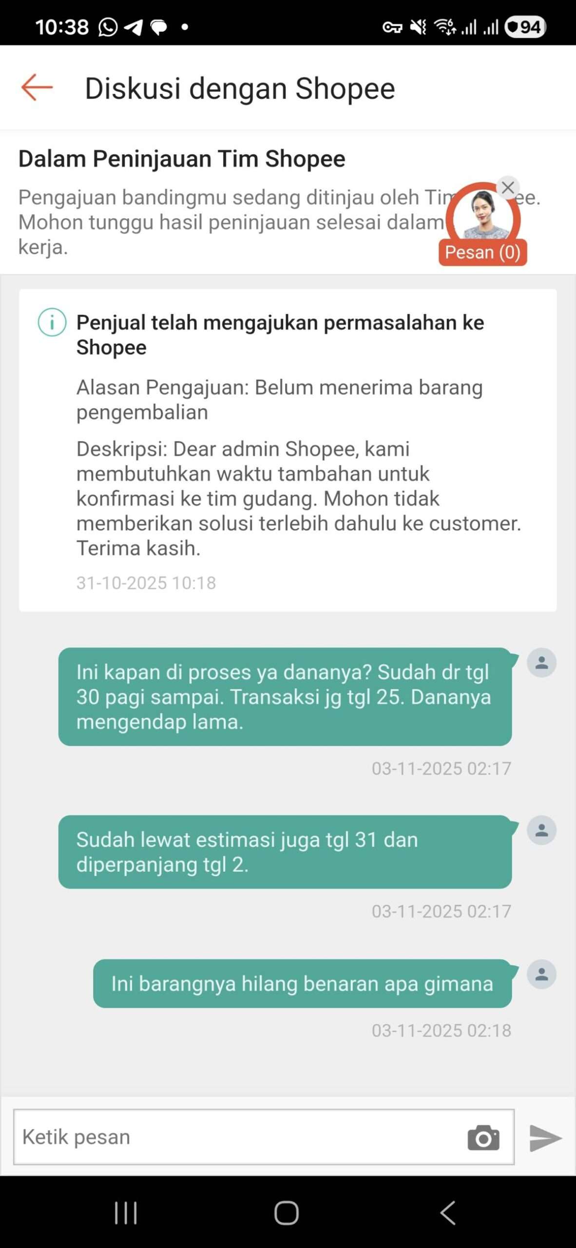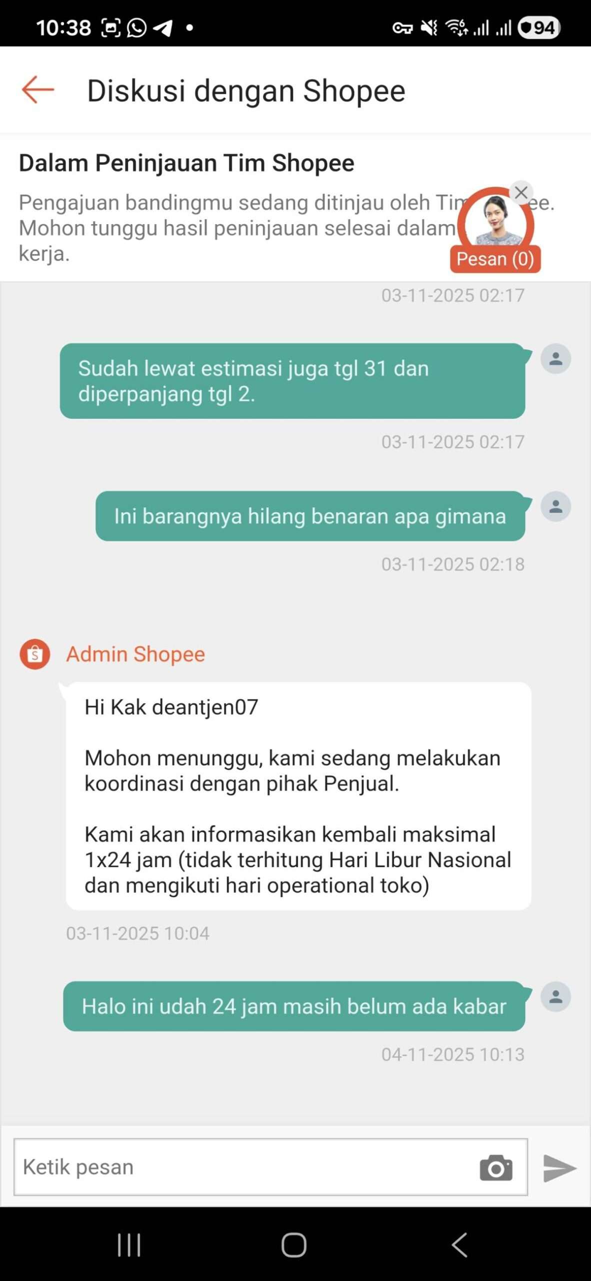 Pada 2 November 2025, saya menghubungi customer service kembali, dan dari diskusi tersebut akhirnya ada perpanjangan lagi selama 1 x 24 jam. Padahal seharusnya pada pukul 10 pagi tanggal 4 November sudah ada keputusan.