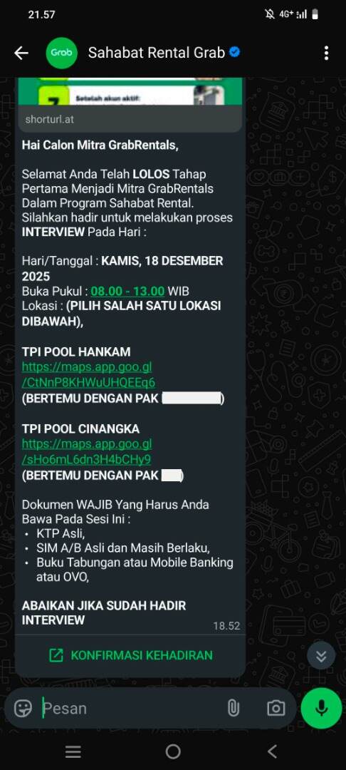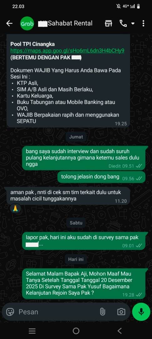 Permasalahan ini bermula dari pesan WhatsApp yang saya terima dari akun “Sahabat Rental Grab” pada tanggal 11 Desember 2025. Dalam pesan tersebut, saya dinyatakan terpilih untuk bergabung kembali menjadi mitra TPI Grab melalui program keringanan overdue rental fee. Dikatakan juga bahwa program ini hanya diberikan kepada mitra Grab terpilih dengan performa baik, berlaku hingga 31 Desember 2025, dan memiliki kuota terbatas.