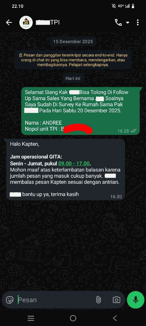 Namun, sangat disayangkan, hingga tanggal 22 Desember 2025, saya tidak mendapatkan informasi lanjutan apa pun terkait hasil interview maupun hasil survey tersebut. Pihak sales TPI atas nama A** justru terkesan cuek, tidak responsif, dan tidak memberikan kejelasan setiap kali saya menghubungi melalui WhatsApp.
