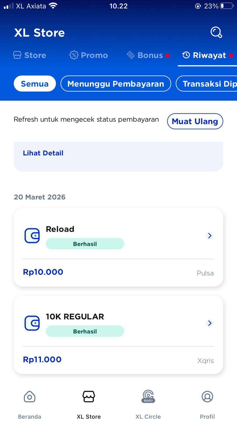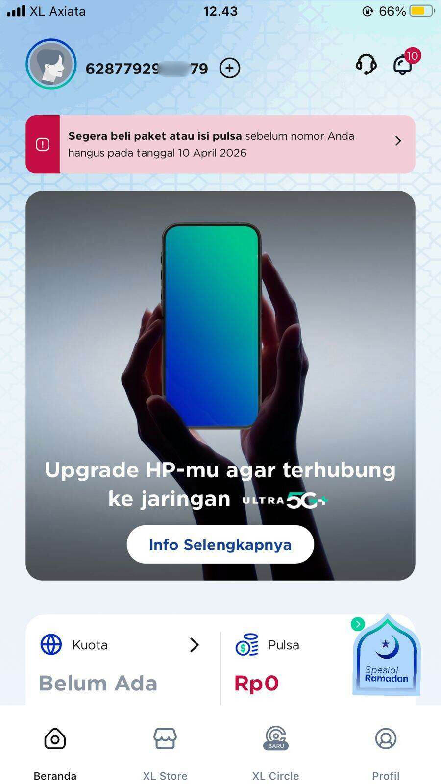 Awalnya saya melakukan pengisian pulsa pada tanggal 20 Maret 2026, karena saat saya membeli kartu perdana ini, nomornya sudah masuk masa tenggang. Jadi saya melakukan pengisian pulsa dengan nominal 10.000 agar bisa menambah masa aktif kartunya.