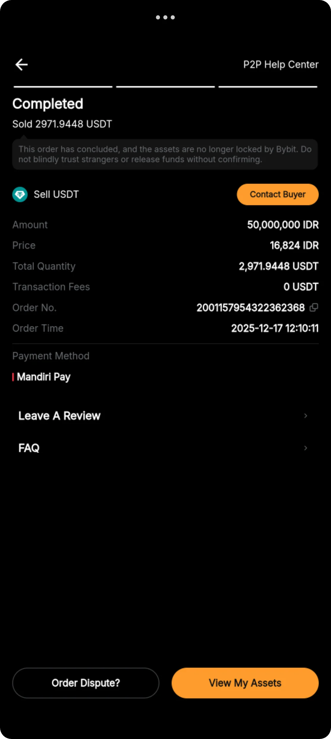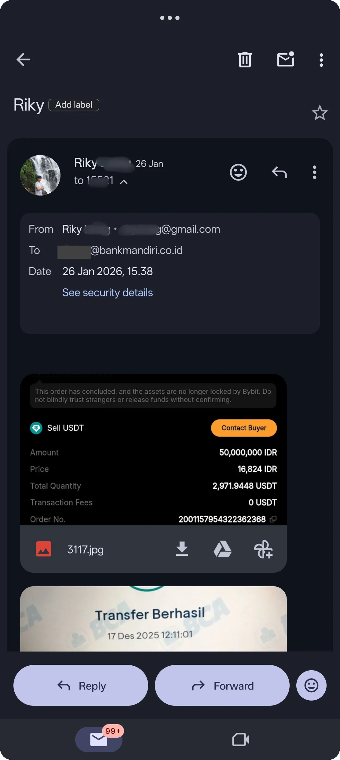 Pembeli melakukan pembelian 2.971,9448 USDT pada tanggal 17 Desember 2025 pukul 12.10.11 dan sudah memberikan bukti transfer. Saya juga diminta untuk mengisi surat pernyataan atas transaksi tersebut. Saya kirimkan data tersebut ke email pihak cabang Bank Mandiri tersebut.