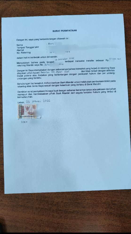 Kejadian dimulai sekitar tanggal 20 Desember 2025, rekening Mandiri saya tiba-tiba tidak dapat melakukan transaksi tanpa informasi apa pun. Pada tanggal 24 Desember 2025, saya mengunjungi cabang Mandiri untuk menanyakan status tersebut.