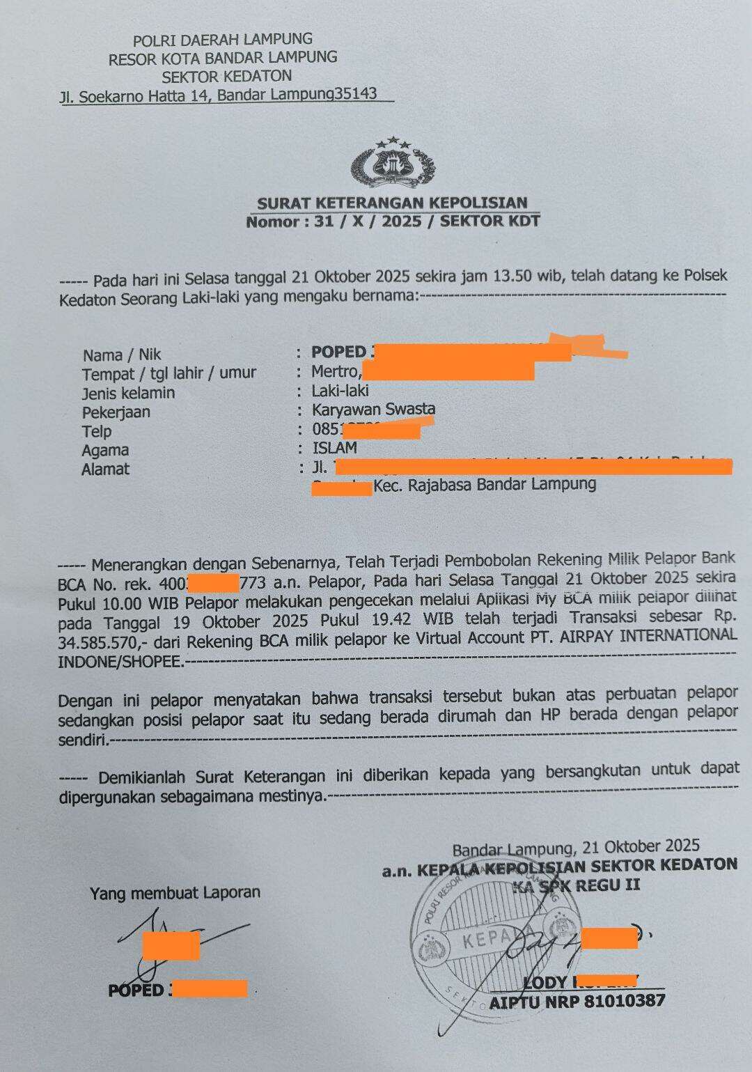 Kronologinya, pada hari Selasa, 21 Oktober 2025, pukul 10.00 WIB, setiba di kantor saya melakukan cek saldo menggunakan aplikasi myBCA. Di situ saya kaget karena saldo saya berkurang drastis. Segera saya lihat mutasi rekening, dan terlihat bahwa ada transaksi pada hari Minggu, 19 Oktober 2025, sebesar Rp34.585.570 ke PT Airpay/Shopee dengan cara virtual account, di mana nomor VA tersebut bukan nomor yang biasa saya pakai.
