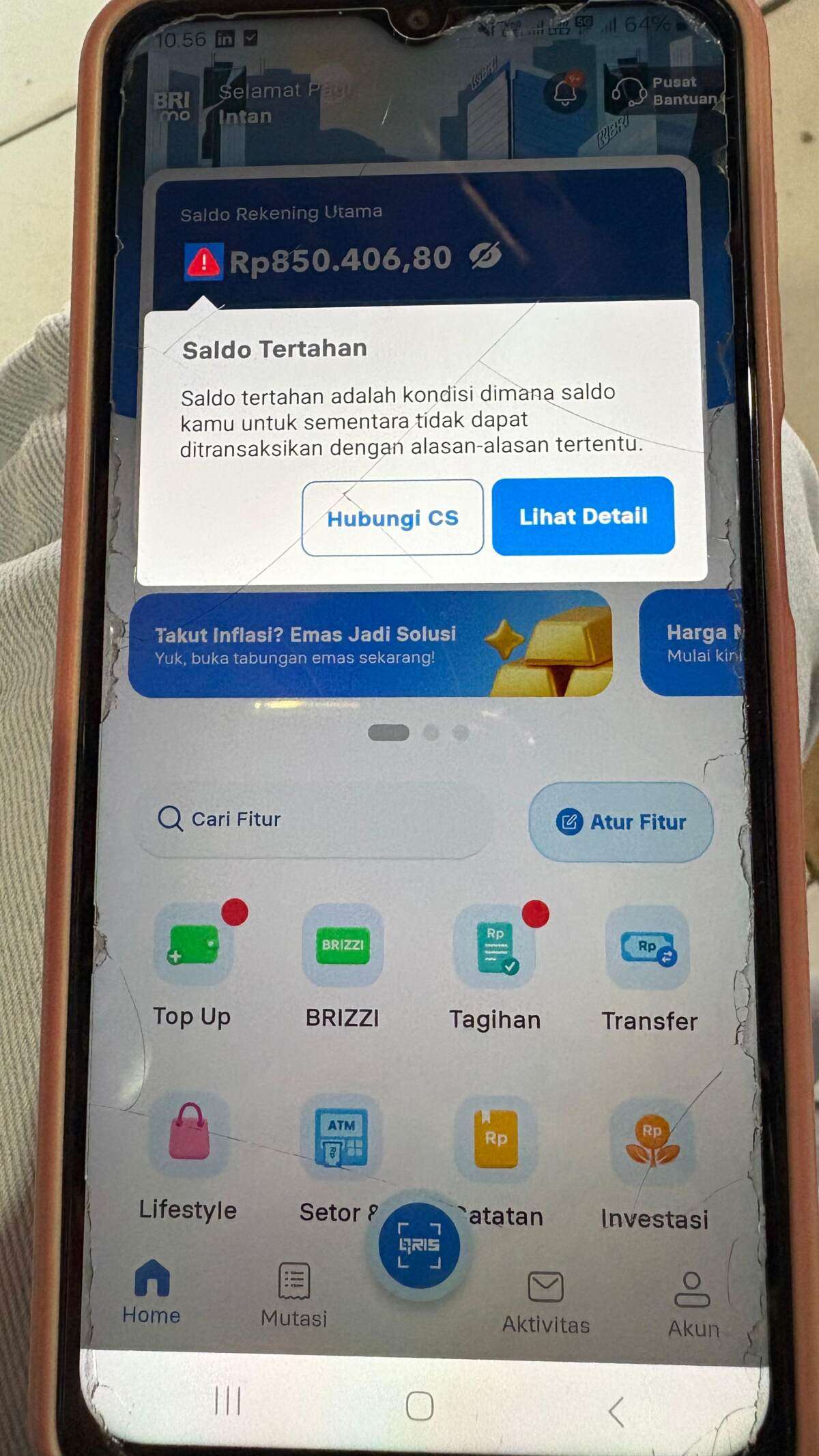 Saya sehari-hari bekerja di Pasar Induk Cimol Gedebage, Bandung, dengan gaji Rp3.000.000 per bulan. Namun, pada tanggal 13 Januari 2026, saldo rekening BRI saya dengan nomor 215501007****01 tiba-tiba dibekukan sebesar Rp850.000.