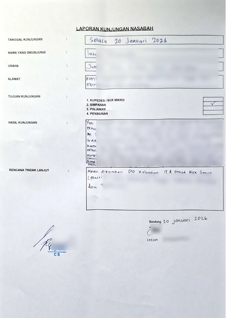 Pada tanggal yang sama, saya segera melapor ke Customer Service Kantor BRI Unit Bea Cukai. Setelah itu, pihak BRI Unit Kantor Bea Cukai datang mengunjungi saya di Pasar Cimol Gedebage. Saat itu saya mendapatkan informasi bahwa bahwa rekening saya tidak dapat digunakan karena adanya transaksi mencurigakan sebesar Rp9.000.000.000 yang dilaporkan oleh OJK. Kemudian saya pun menandatangani surat laporan kunjungan nasabah.
