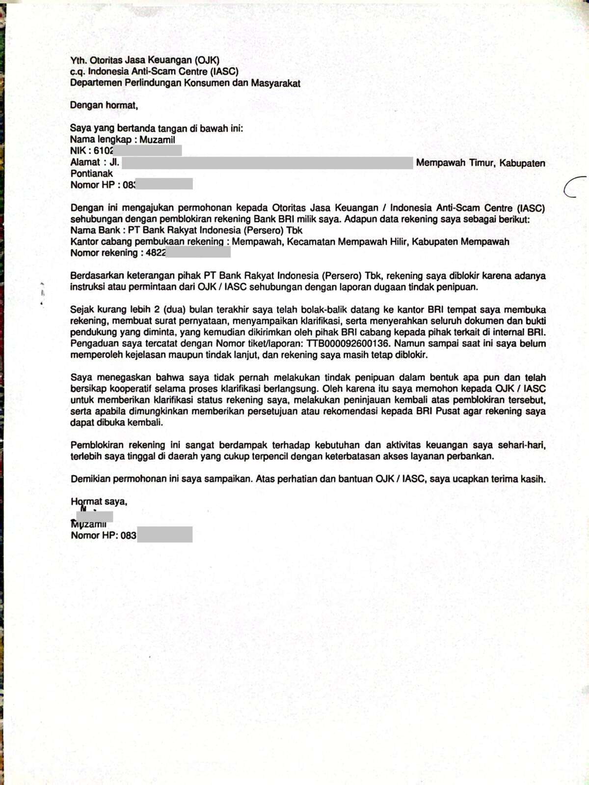 Pemblokiran rekening ini, berdasarkan keterangan pihak bank, dilakukan atas adanya instruksi atau permintaan dari OJK melalui Indonesia Anti-Scam Centre (IASC) dengan nomor tiket: 5309386766, terkait dugaan tindak penipuan. Namun hingga saat ini, saya tidak pernah mendapatkan penjelasan yang transparan maupun bukti yang jelas atas tuduhan tersebut.