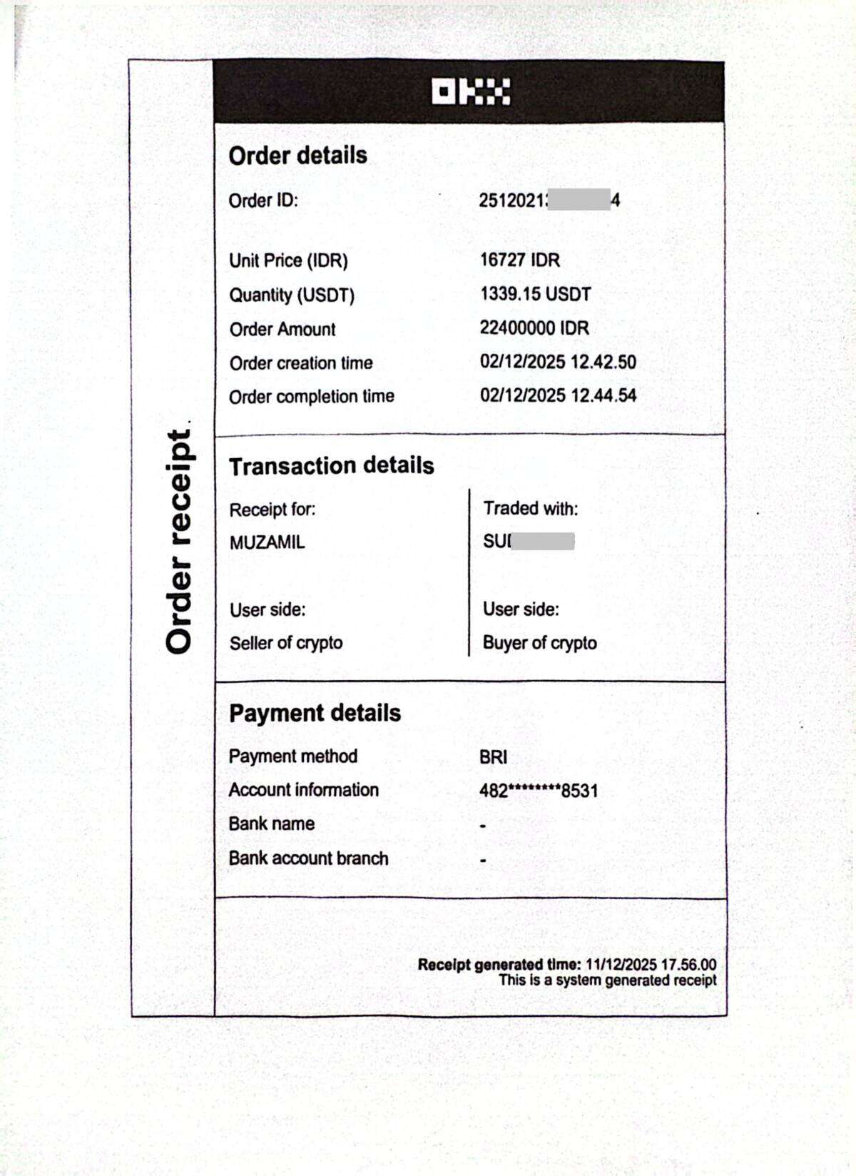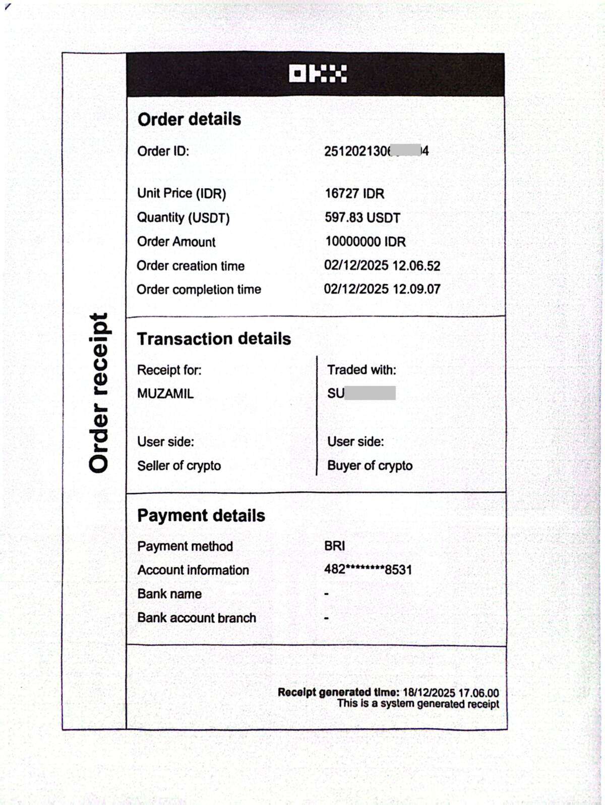 Saldo saya yang tertahan saat ini adalah sekira Rp106 juta dan saya mendapatkan dana tersebut dari hasil perkebunan, komisi dari penyewaan alat berat, dan juga gaji dari pekerjaan saya. Transaksi yang menyebabkan rekening saya terblokir, adalah transaksi melalui platform OKX, platform luar negeri, dan saya tidak saling mengenal dengan pihak pembeli.