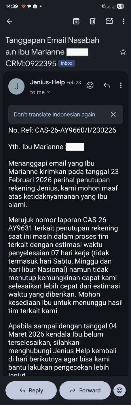 Saya sudah capek dengan Jenius.Hingga hari ini, belum ada pihak Jenius yang menghubungi saya. Bayangkan, uang yang ditahan sejak 28 Oktober 2025 selama 6 bulan, berapa banyak yang sudah hilang? Saya sudah menelepon Jenius berkali-kali, hingga akhirnya, saya mendapatkan nomor laporan: CAS-26-AQ6999 pada tanggal 4 Februari 2026. Kemudian pada tanggal 23 Februari 2026 dengan nomor laporan: CAS-26-AY9631 dan pada tanggal 10 Maret 2026 dengan nomor laporan: CAS-26-BG4706.