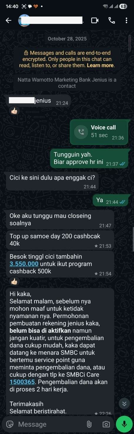 Tak lama setelah saya pulang, marketing tersebut mengirim pesan melalui WhatsApp dan memberitahukan bahwa pembukaan rekening saya tidak disetujui. Saya meminta agar marketing tersebut bertanggung jawab untuk menyelesaikannya. Terlampir bukti percakapan WhatsApp saya dengan marketingnya, dan bahkan dia meminta saya untuk menyetor lagi Rp3,5 juta keesokan harinya.