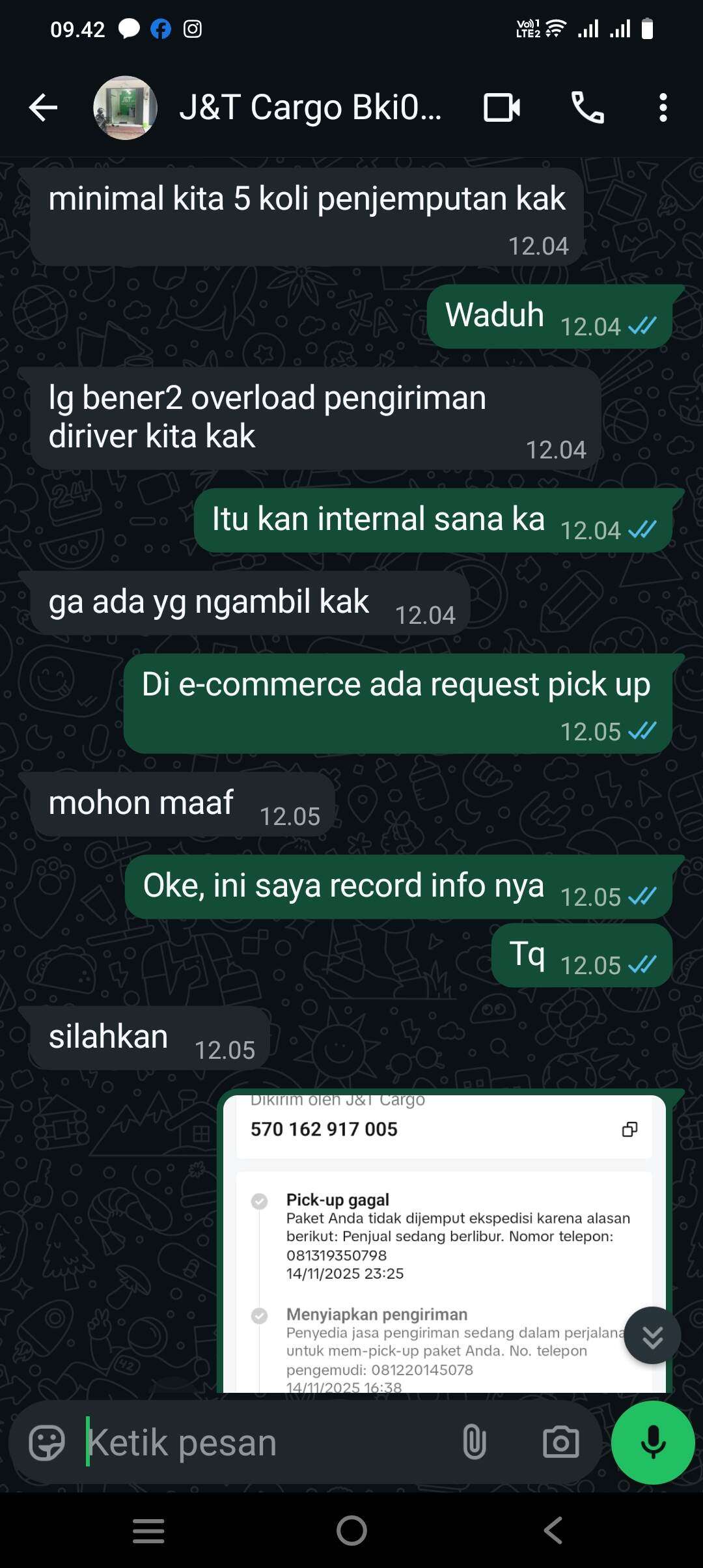 Menurut admin J&T Cargo BKI058A: Sesuai SOP J&T Cargo, maksimal paket yang dapat di-pick up adalah 5 koli. Tetapi pada TikTok Shop, paket yang di-pick up tidak ada minimum dan terdapat pilihan opsi pick up. Serta alasan lainnya, mereka tidak bisa pick up karena kekurangan tenaga kerja.