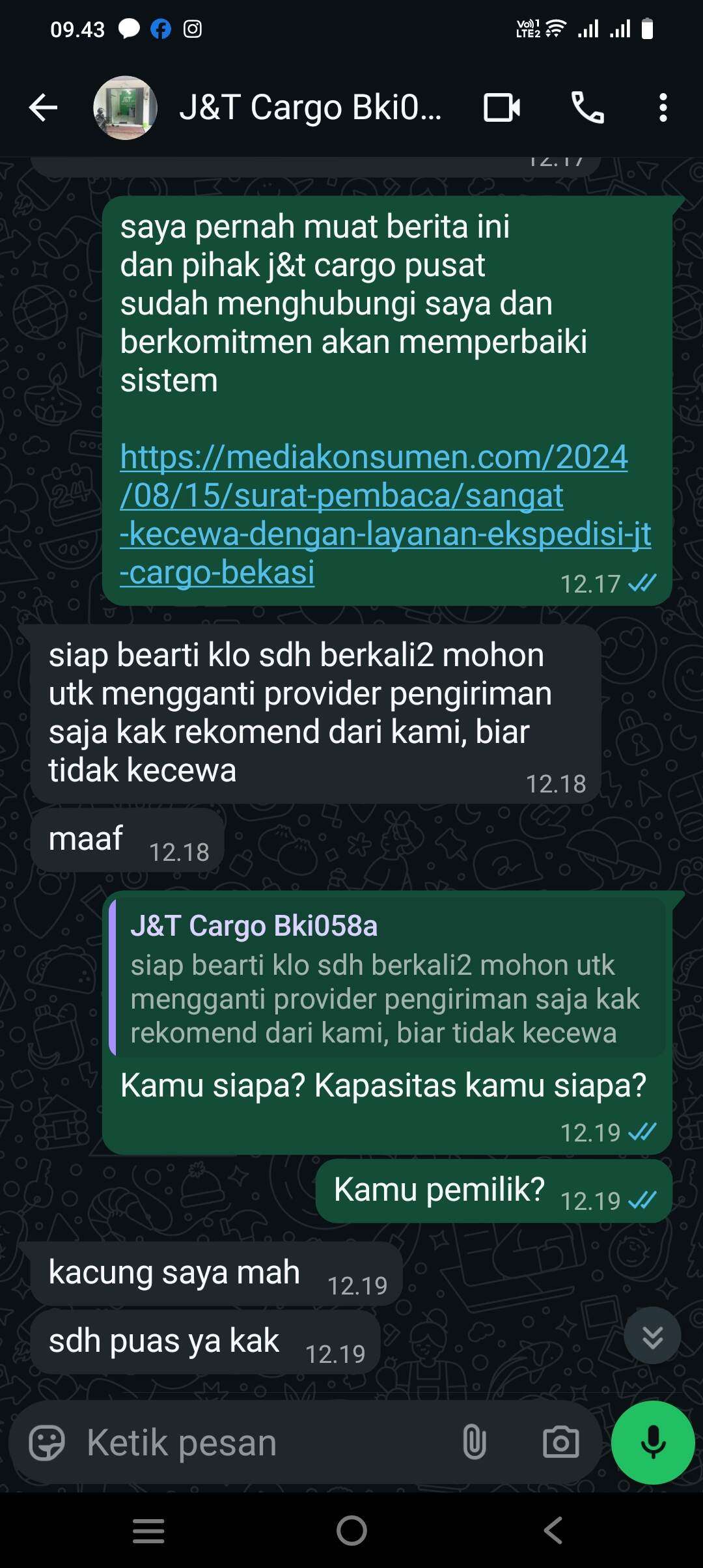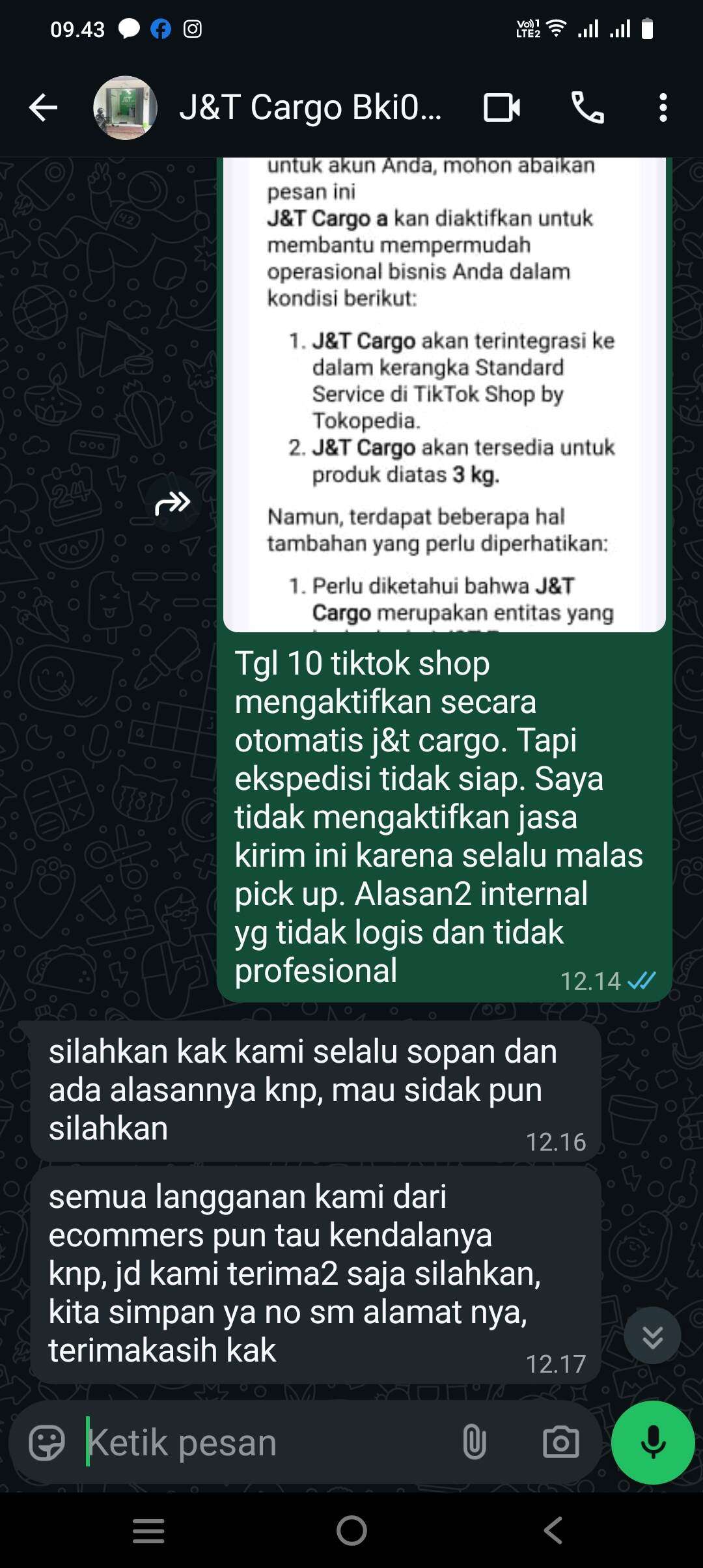Kepada J&T Cargo, apakah benar yang disampaikan oleh admin BKI058A? Dan apakah sudah benar attitude yang dilakukan admin tersebut? Dan sudah sesuai SOP yang ada? Jika benar, abaikan saja surat pembaca ini. Jika salah, tolong admin yang bersangkutan klarifikasi kembali atas kekeliruan SOP yang sudah disampaikannya.
