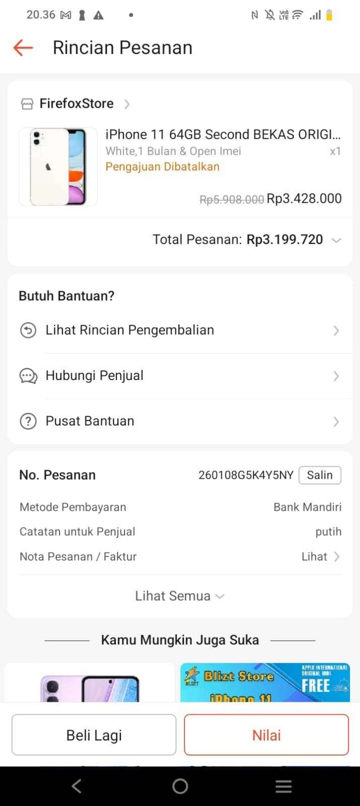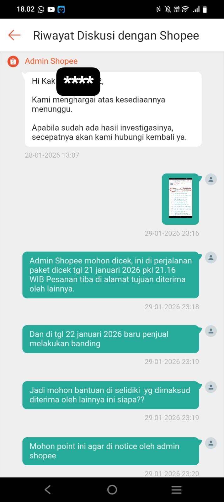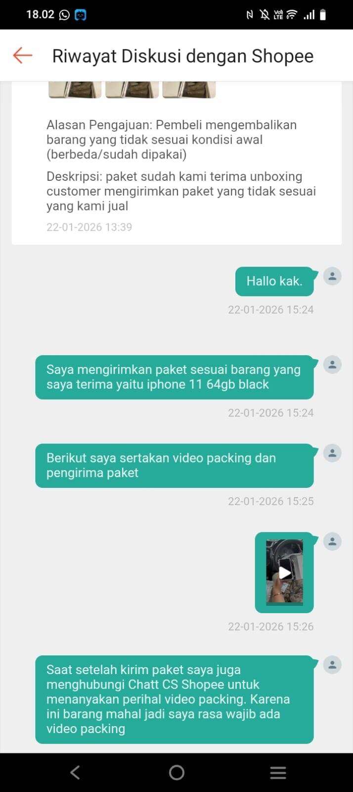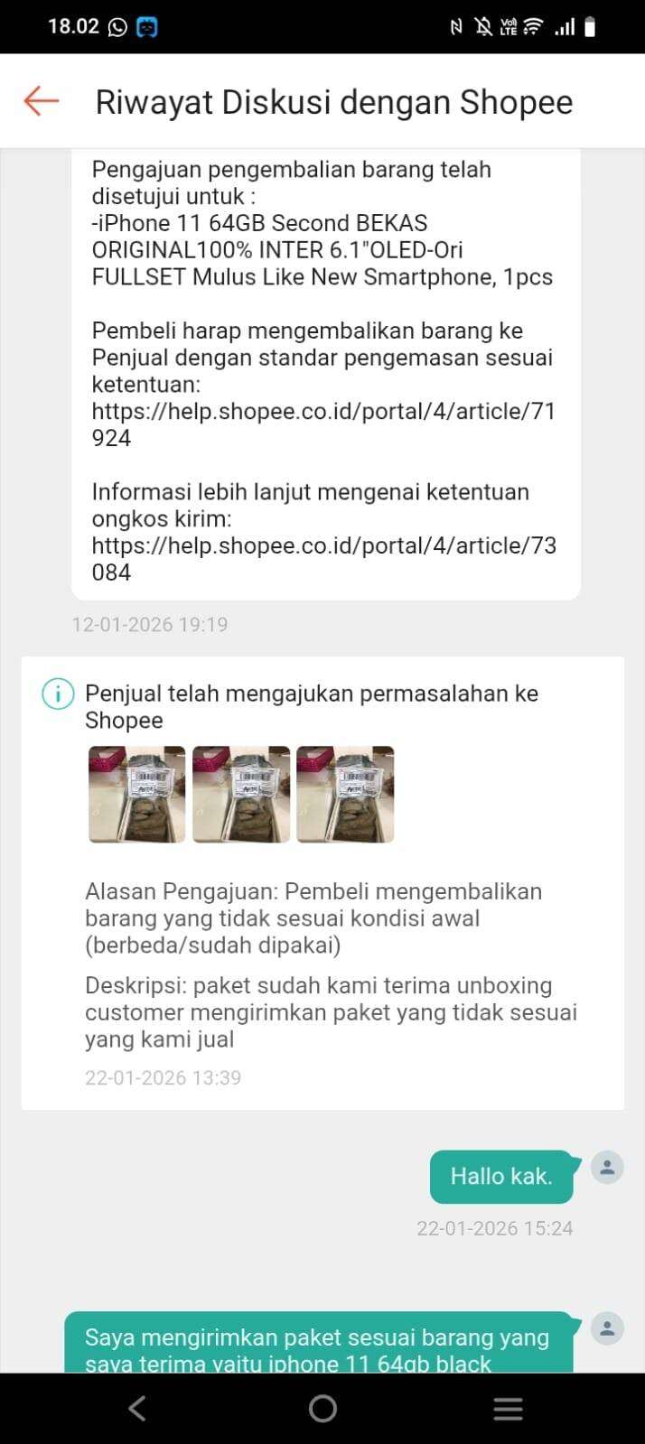 Tanggal 22 Januari 2026, penjual melakukan banding dengan alasan paket yang diterima tidak sesuai (hp berubah menjadi batu) hanya dengan menyertakan foto.