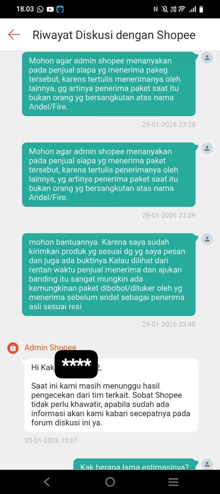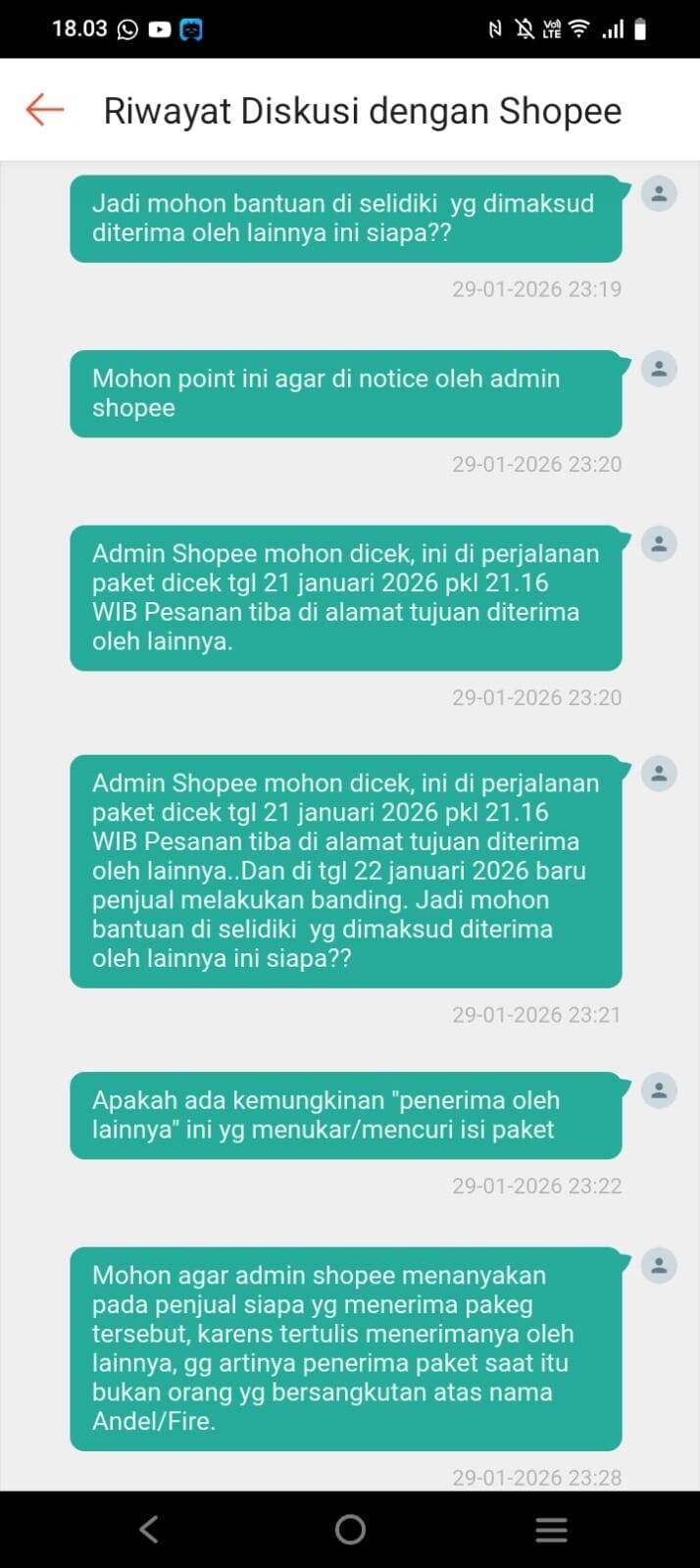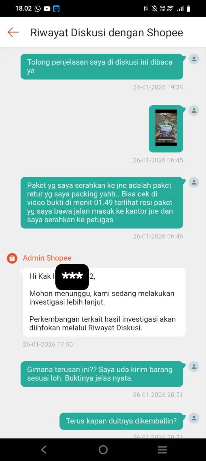 Bener-bener Shopee ya, hanya memikirkan mendapat uang admin penjualan saja sehingga dia bersekongkol dengan penjual untuk menipu saya. Seharusnya Shopee melakukan investigasi lebih mendalam, karena paket sebelumnya sempat diterima oleh orang lain dalam satu malam dan baru diterima oleh penjual keesokan harinya. Ada banyak kemungkinan kenapa paket itu bisa berpindah tangan.