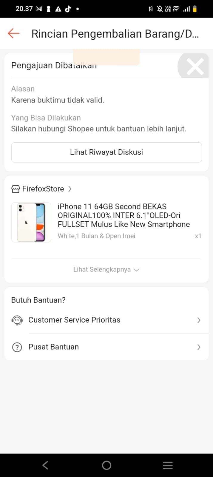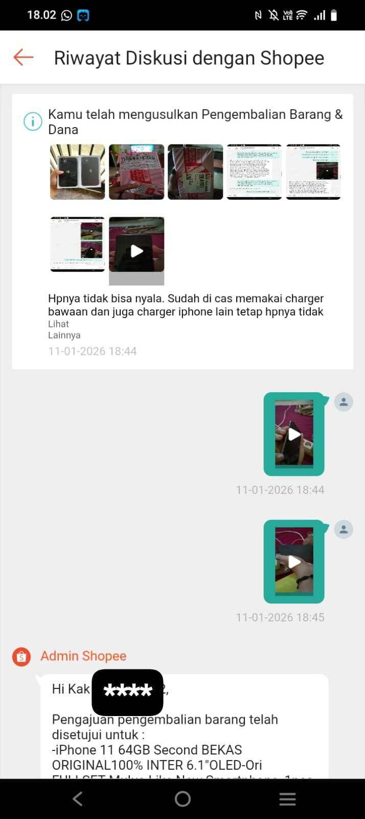 Saya memesan 1 pcs iPhone 11 64GB second di Shopee sebagai hadiah ulang tahun untuk adik saya, dengan nomor pesanan: 260108G5K4Y5NY. Namun ponsel sampai dalam kondisi tidak bisa menyala. Akhirnya saya menghubungi penjual dan penjual menyarankan untuk melakukan retur. Setelah itu, saya mengirimkan barang retur dengan resi yang sudah otomatis tersedia di Shopee (kurir JNE Express, dengan nomor resi: CM759746200520.