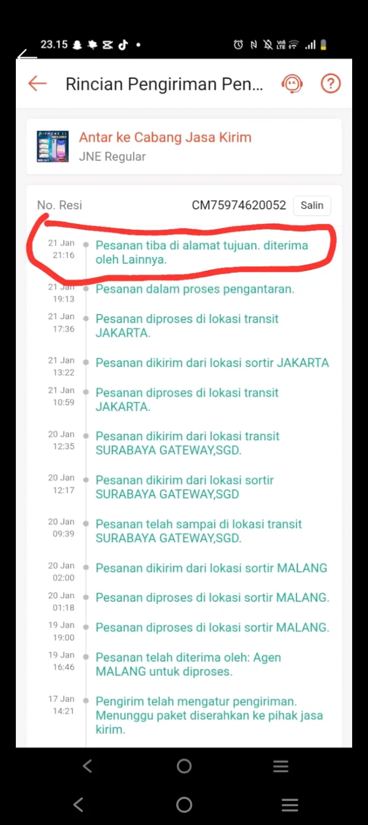 Tanggal 21 Januari 2026, paket diterima oleh orang lain (bukan yang bersangkutan/penjual).