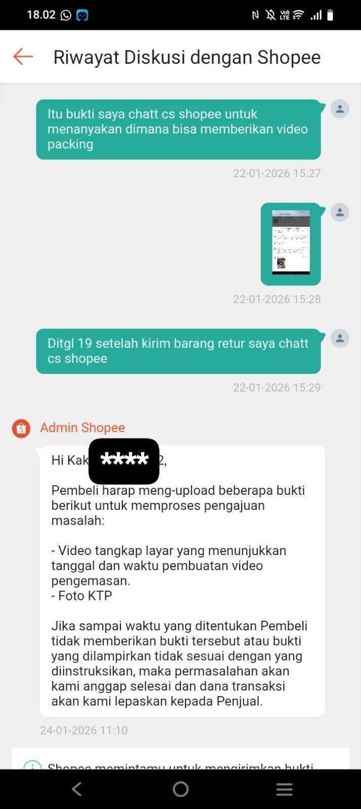 Setelah itu, saya langsung menunjukkan bukti packing saya dan juga bukti riwayat percakapan saya dengan CS Shopee saat saya menanyakan cara mengirim video packing. Setelah itu, Admin Shopee meminta waktu untuk melakukan investigasi ke ekspedisi.