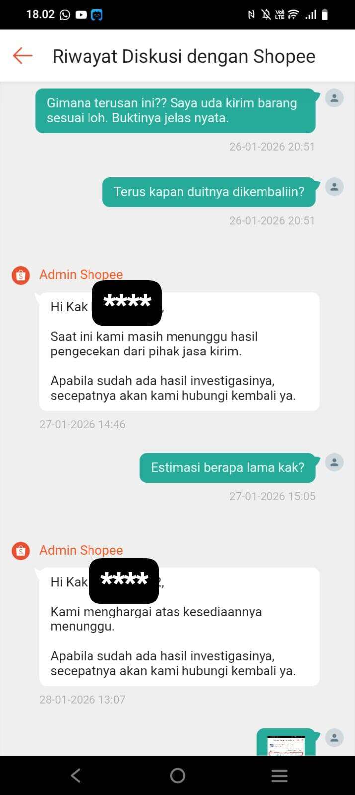 Hingga akhirnya pada tanggal 03 Februari 2026, tiba-tiba saja Shopee menutup komplain saya sepihak dan menolak komplain saya dengan alasan yang rancu, alasan yang mengada-ada, dan uang saya sudah diteruskan ke penjual. Padahal saya sudah mengirim barang retur ke penjual, tetapi uang saya hilang tanpa ada barang atau yang lainnya.