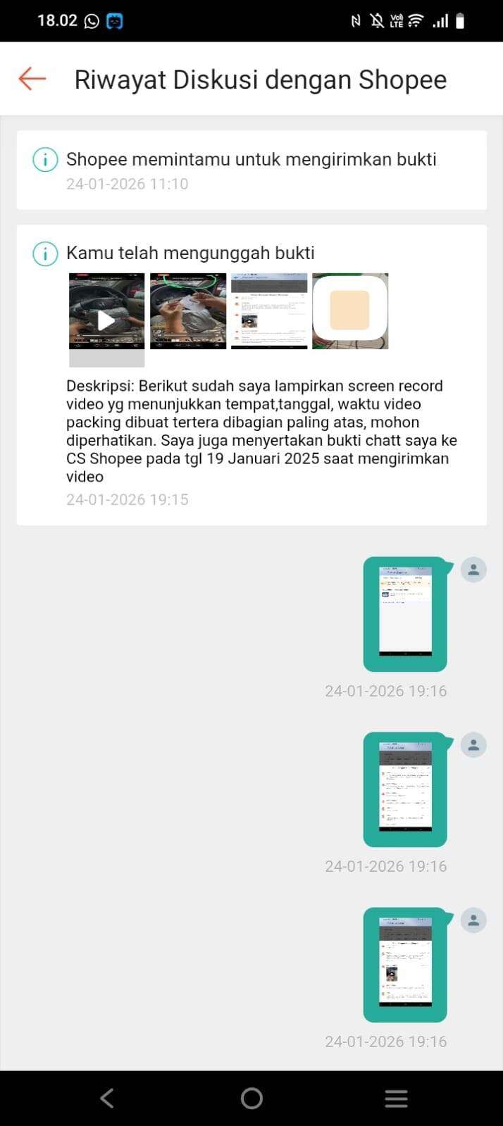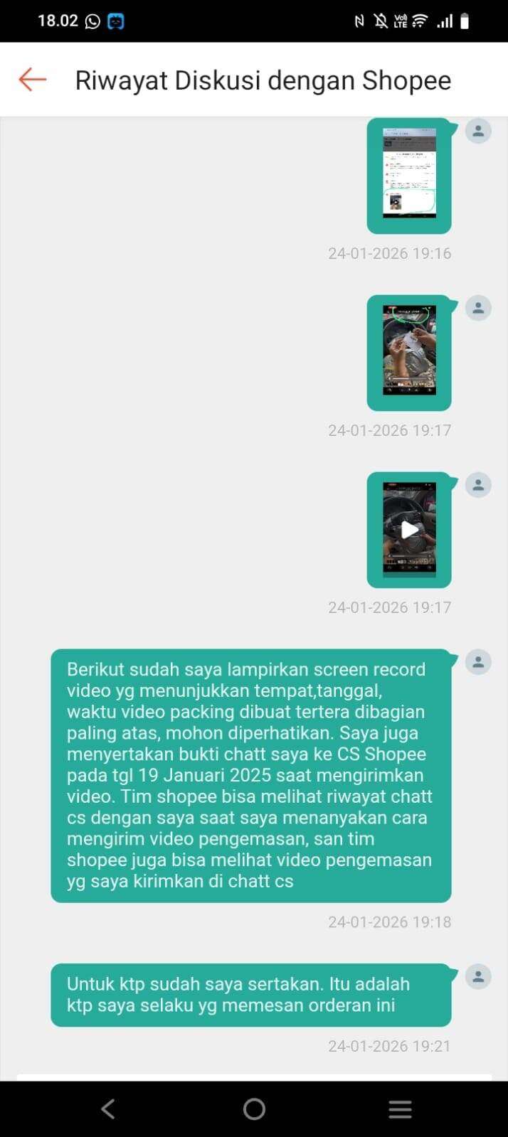 Tanggal 19 Januari 2026, saya mengirim paket melalui JNE. Saya memvideokan proses packing HP hingga menyerahkannya kepada petugas JNE tanpa jeda. Saya juga menghubungi CS Shopee untuk menanyakan cara meng-upload video packing. Saya juga mengirimkan video packing ke CS Shopee (bisa dilihat video yang saya sertakan di bawah).