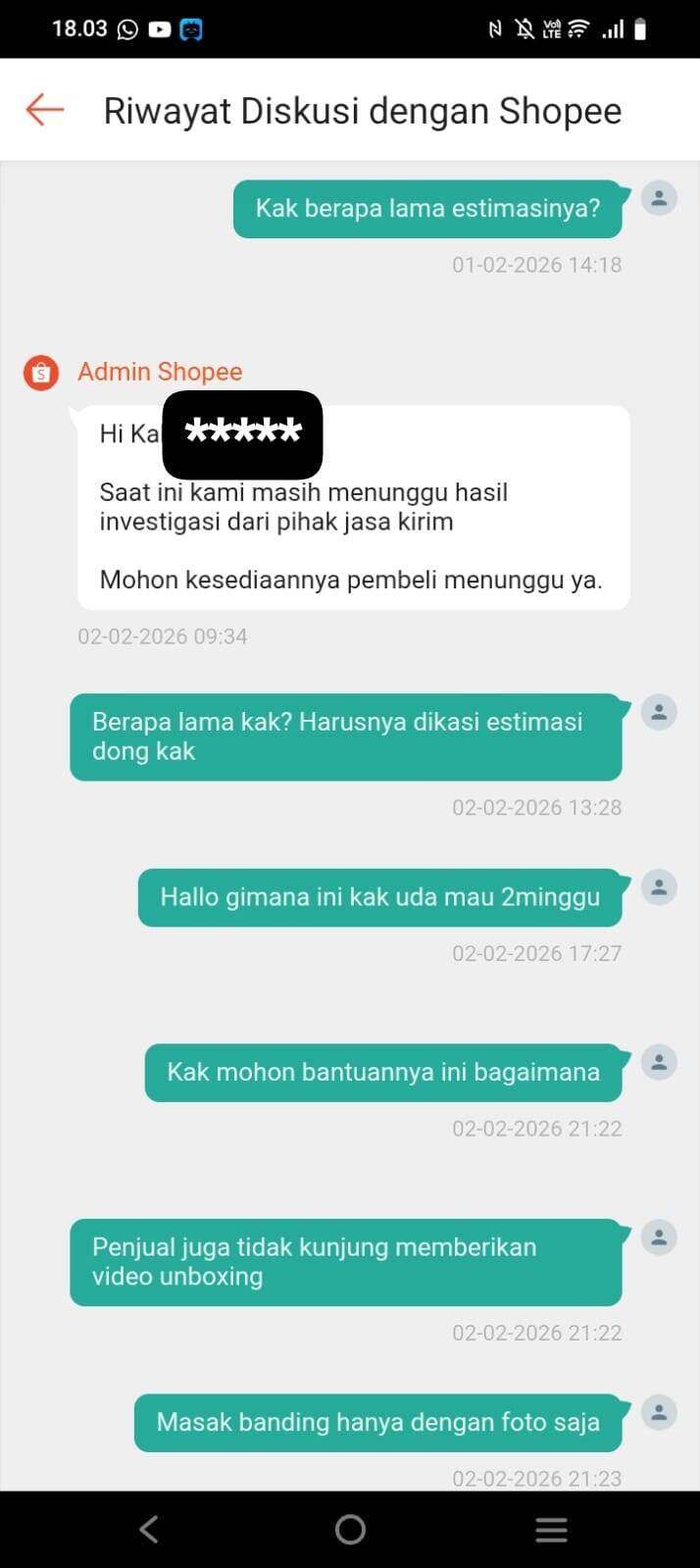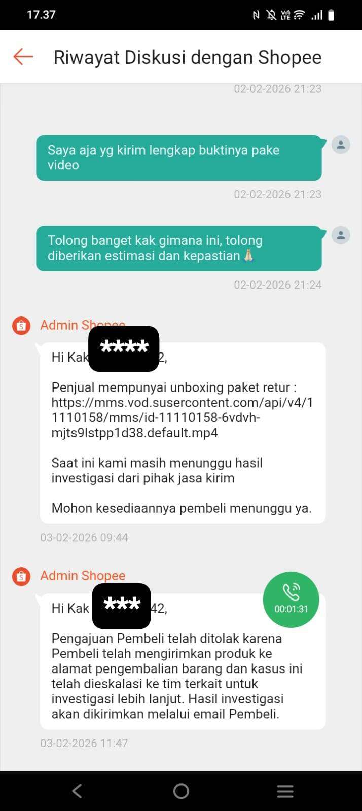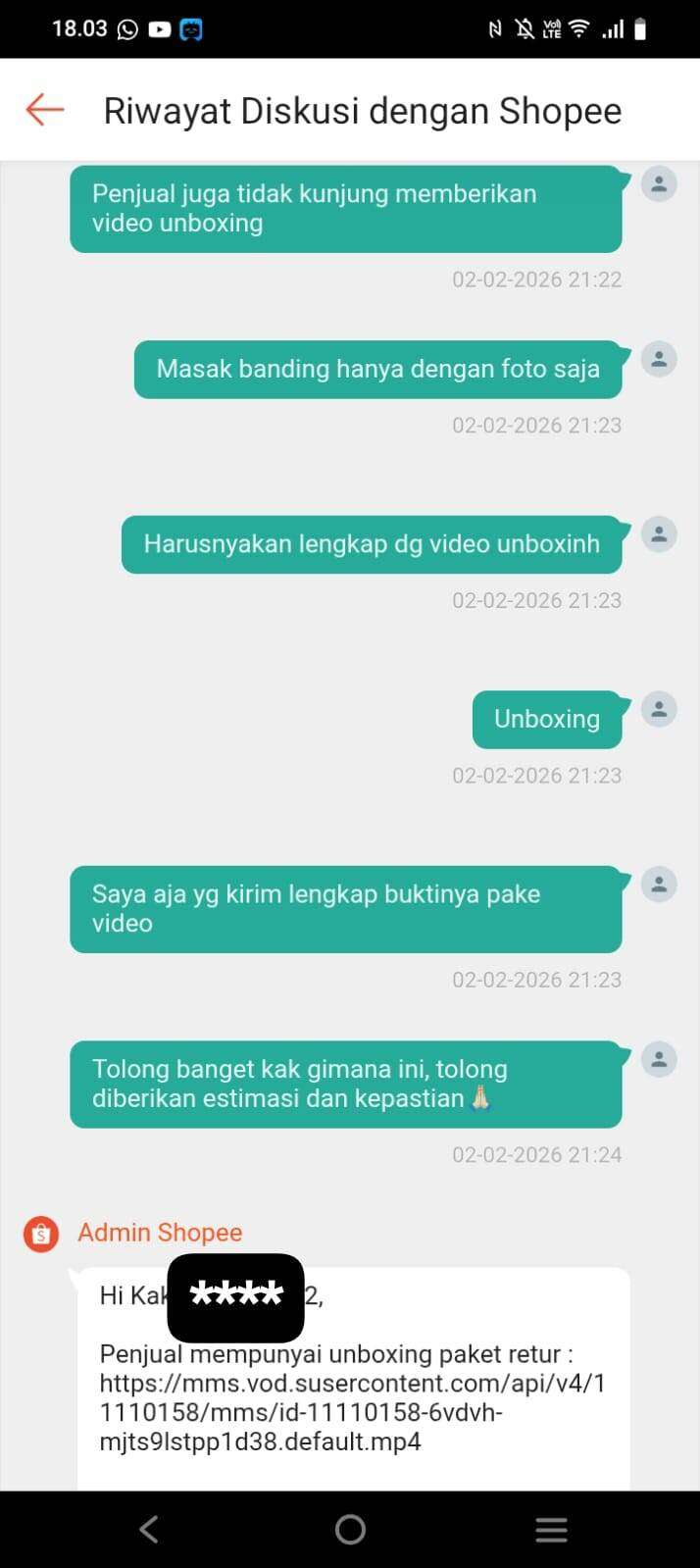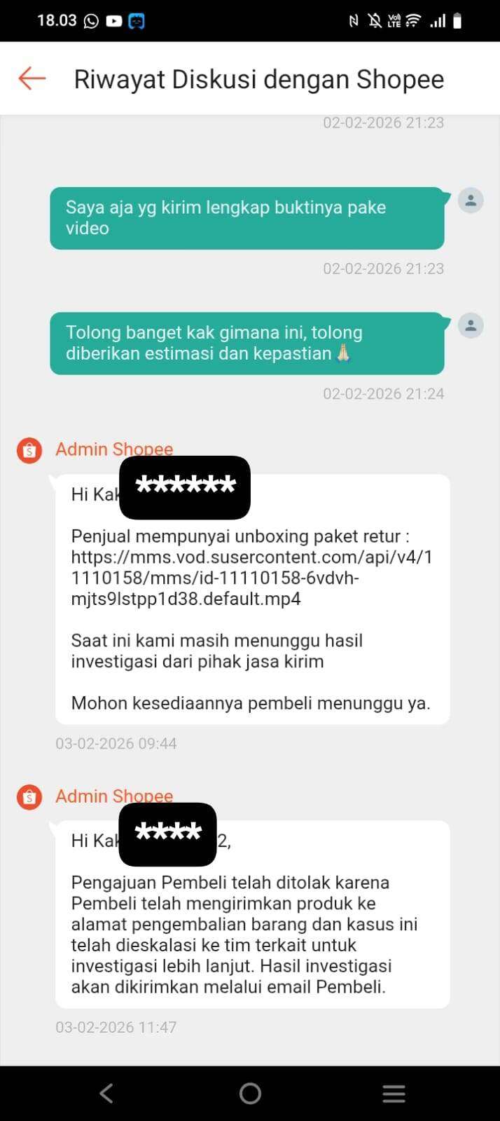Penjual baru mengirim video unboxing pada tanggal 03 Februari 2026, padahal sudah diminta beberapa hari lalu. Langsung saja Shopee menutup komplain. Sementara saya yang sudah kooperatif langsung memberikan semua bukti malah dipermainkan dan uang saya dicuri seperti ini.