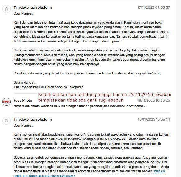 Selama J&T Express mengabaikan bukti kerusakan yang begitu jelas, penjual akan terus berada di posisi paling dirugikan tanpa ada pihak yang membela kepentingan kami. Kami berharap J&T Express melakukan evaluasi menyeluruh dan memberikan pertanggungjawaban yang layak atas kerugian yang kami alami.