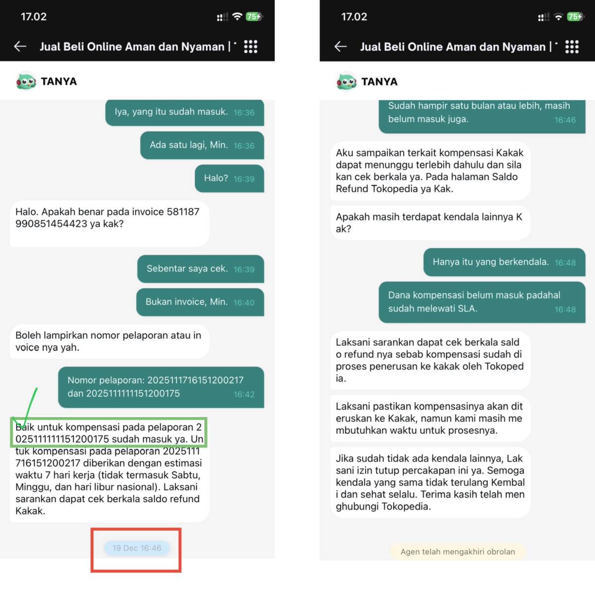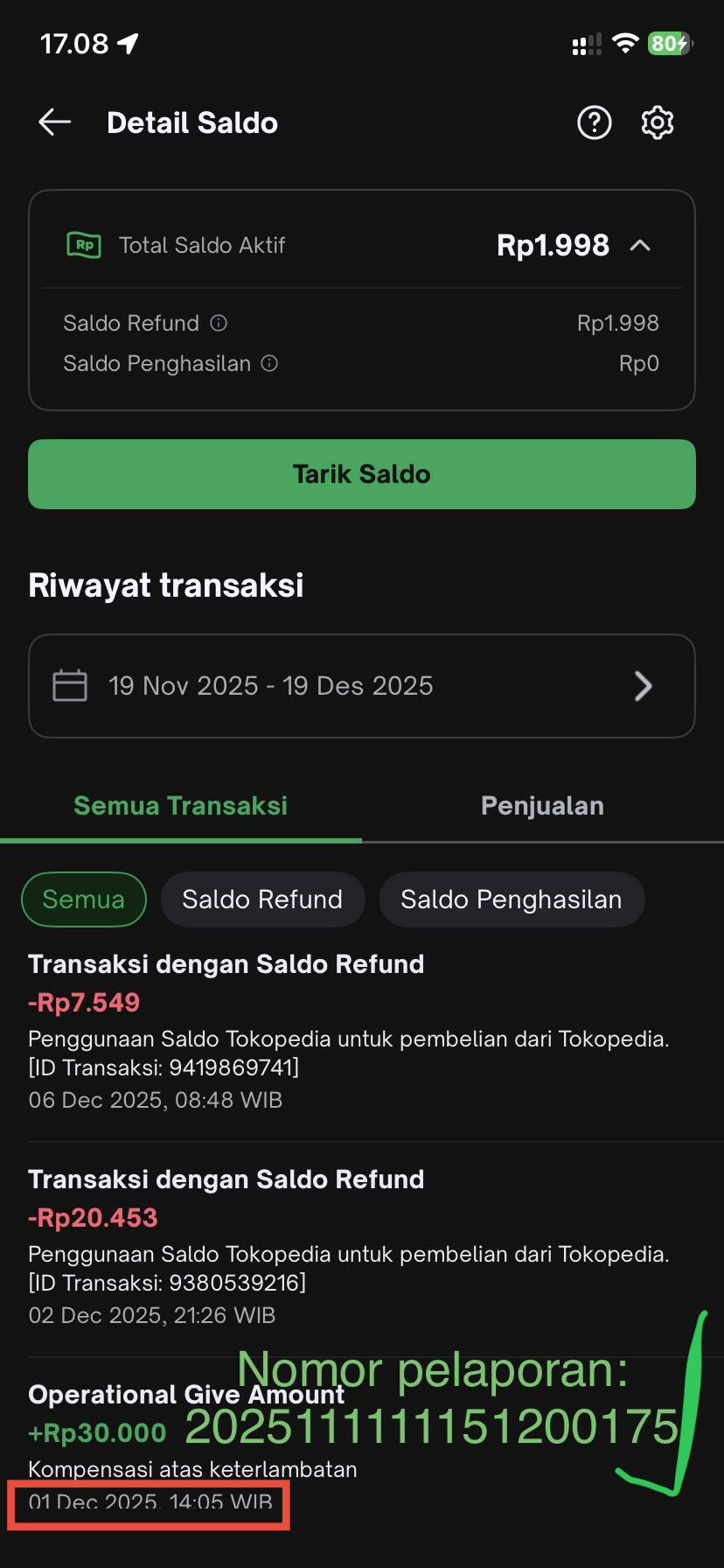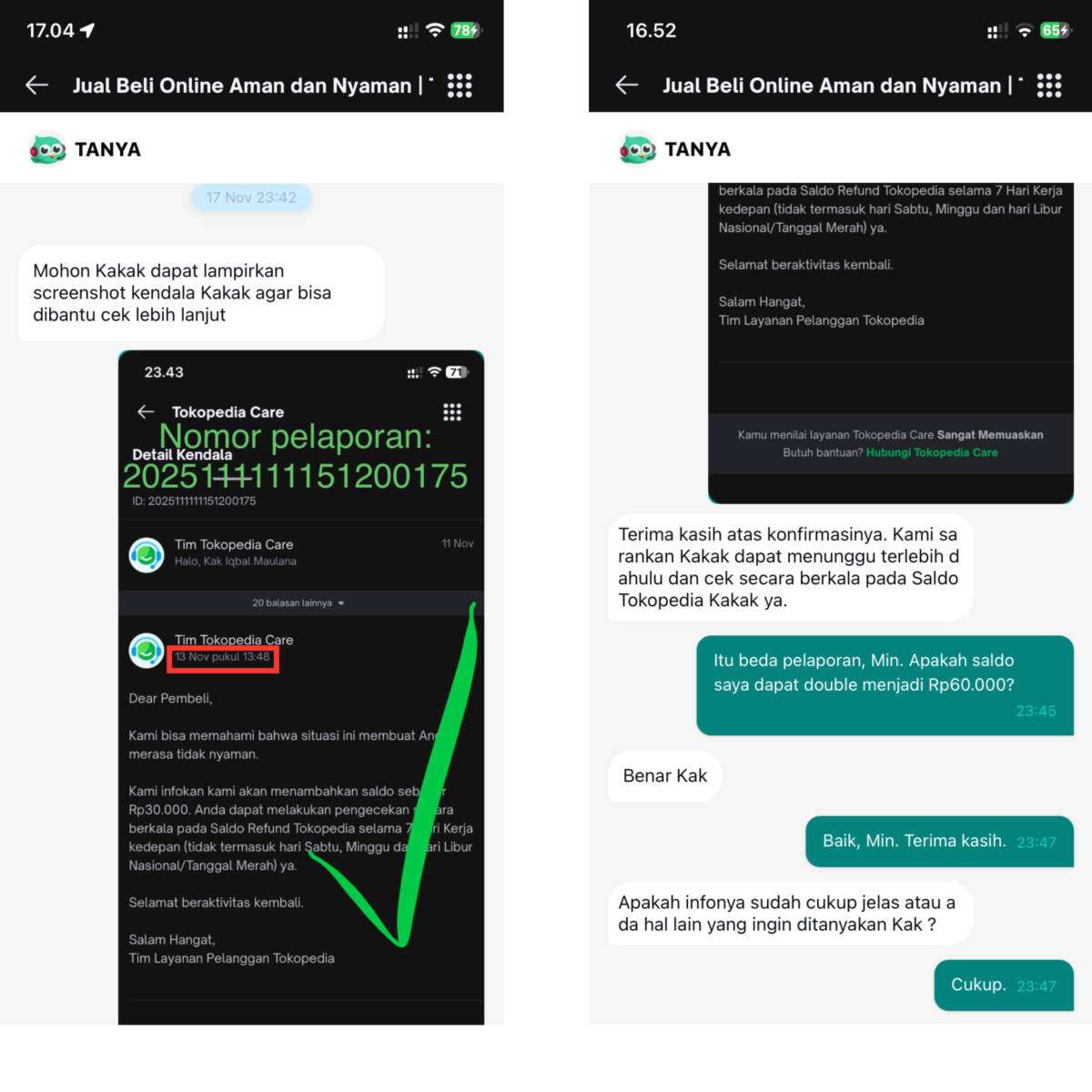 Saya menerima dua saldo kompensasi dari Tokopedia pada tanggal 13 November 2025 dengan nomor laporan 2025111111151200175 dan pada tanggal 17 November 2025 dengan nomor laporan 2025111716151200217 terkait pengiriman kurir yang lama atau bermasalah pada surat pembaca saya sebelumnya.