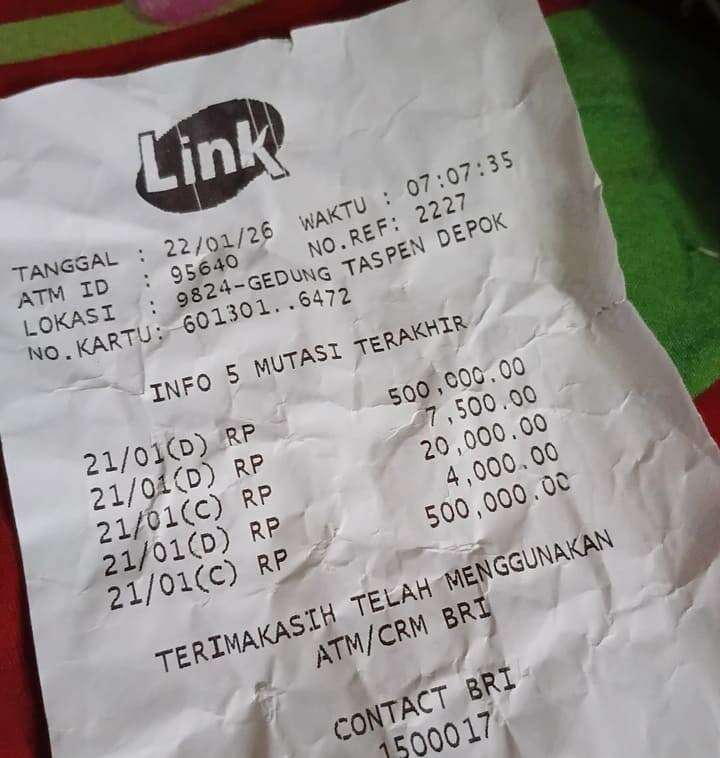 Kamis, 22 Januari 2026, saya mengaktifkan kembali kartu yang terblokir di ATM BRI Taspen. Saat mengecek saldo, saya sangat terkejut karena saldo saya sudah terpotong Rp500.000 untuk transaksi yang gagal semalam. Saya sudah melapor ke Call Center BRI tanggal 22 Januari 2026 pukul 08:00 WIB kemarin.