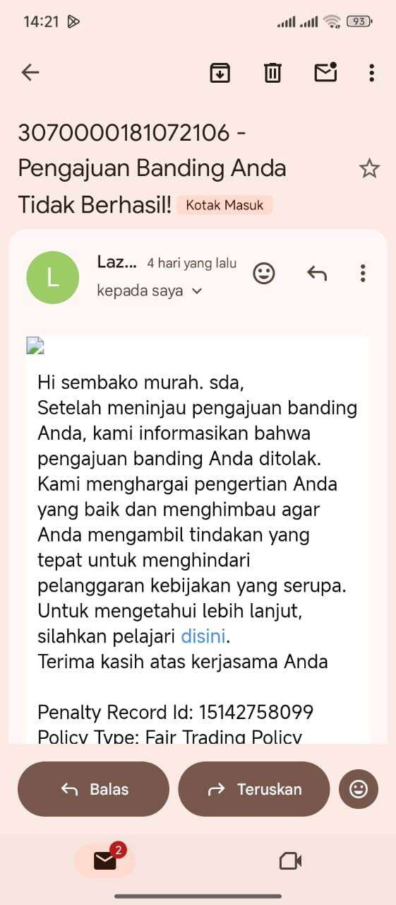 Saya telah mengajukan banding resmi melalui Seller Center Lazada, namun hasilnya ditolak tanpa penjelasan yang detail. Saya bahkan menerima email dengan subjek “Pengajuan Banding Anda Tidak Berhasil” yang hanya berisi imbauan untuk memahami kebijakan tanpa menjelaskan kesalahan yang saya lakukan.