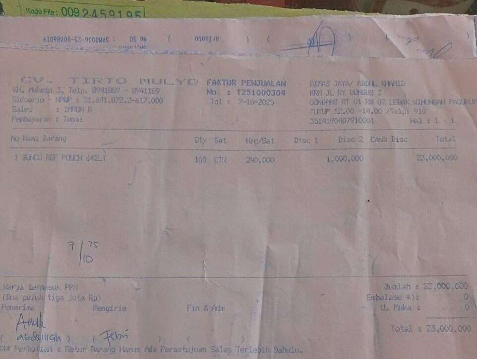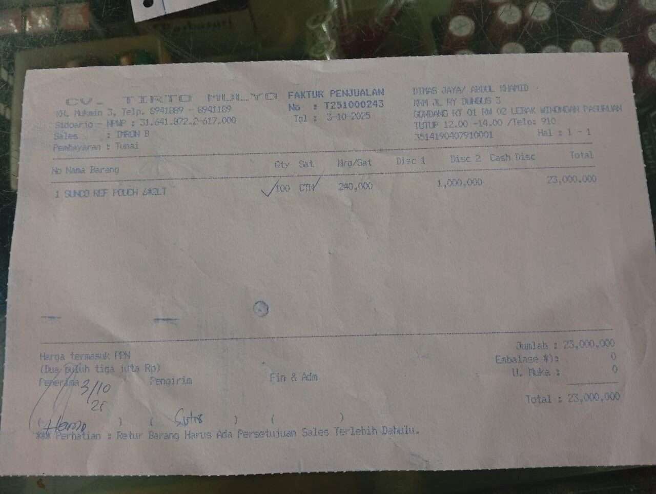 Ini adalah bukti faktur pembelian barang untuk stok yang saya jual, minyak goreng SunCo 2L. Faktur pembelian untuk bukti bahwa saya punya stok untuk produk jualan toko online saya. Sesuai dengan yang saya tulis bahwa saya berjualan secara jujur dan real bukan orderan fiktif.