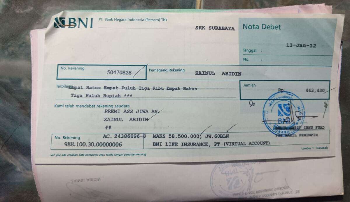 Untuk memastikan asal-usul transaksi tersebut, saya menelusuri dokumen lama saya dari tahun 2012 dan menemukan nomor yang sama, yaitu 243868968. Dokumen tersebut adalah nota dari BNI Insurance Life yang dengan jelas mencantumkan nomor kontrak/nomor polis 243868968. Nomor ini identik dan sama persis dengan nomor yang tercantum pada rekening koran saya sebagai tujuan pemindahan dana.