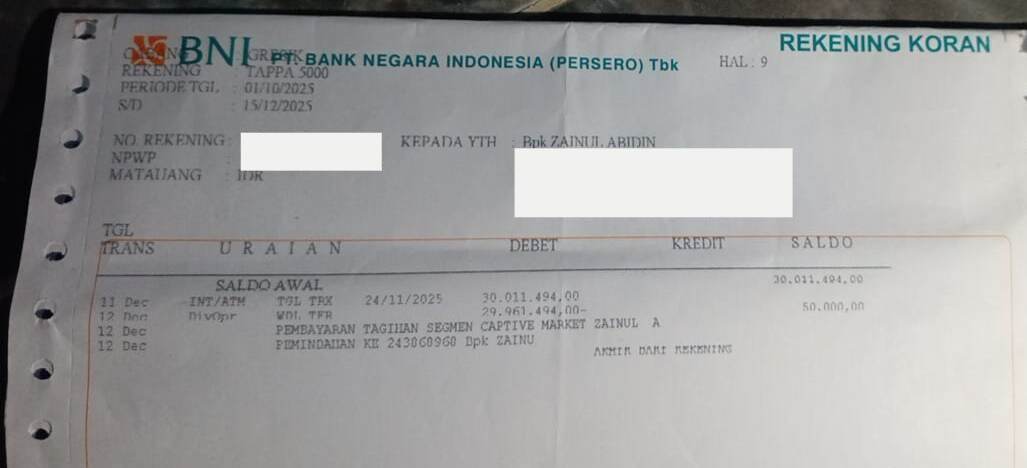 Saya adalah seorang nasabah Bank BNI dengan nomor rekening 12378***39. Masalah ini muncul ketika saya menyadari bahwa saldo rekening saya berkurang hampir Rp 30 juta hingga habis, tanpa adanya transaksi yang saya lakukan secara sadar. Merasa ada yang tidak beres, saya kemudian mencetak rekening koran untuk mencari tahu penyebab kejadian ini.